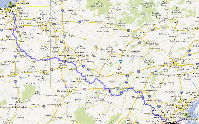 So WTF, Cleveland? I love maps and I enjoy messing with Google Maps, especially the bike route feature. I started looking at off road bike routes and how far one could go on them from this area – there are all of the local trails/routes as well as the C&O and the Great Allegheny Passage all the way to Pittsburgh. Spurred on by former ABRT rider and friend James Prickett’s solo trip to Pittsburgh and back in 2007 (see awesome photo gallery), the fact that I haven’t seen friends in Cleveland for some time, and having recently looked at some maps south of the Cleveland flats, I let Google plot a route from Annapolis to Cleveland. It was pretty good as is, but with some strategic massaging, I got most of it to be off road trails and tow paths. Here’s the route, you can click on it to better explore it: