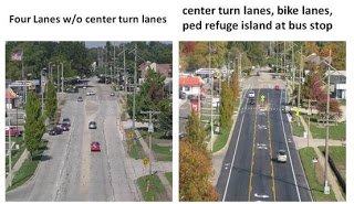 I ran across an image in an urbanism blog showing the result of a “road diet”, where a four lane road and no center turn lanes are very inhospitable to both auto (very hard to make left hand turns) and non-auto traffic (a death ride on a bike):