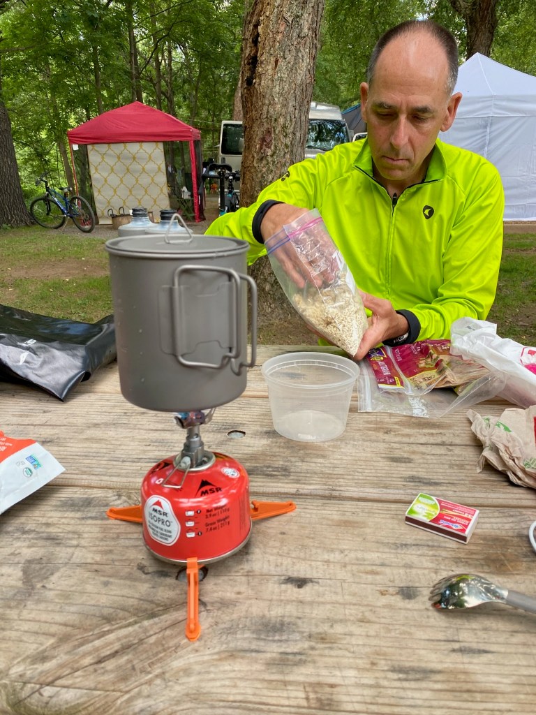 When we got to the Petticoat Junction campground we took a swim in the river, set up the tents, just chilled and “cooked” dinner. The campground was a typical “full service” campground, mostly geared towards RVers or people in tents who arrive in cars, typical of most State Park or commercial campgrounds I’ve stayed in during the last year in my van. These are a great compromise between cost and amenities, waaaay cheaper than a hotel, but not “wild” camping which can be awkward or even impossible in many places unless you are Steve Wallis (side note: check his Stealth Camping playlist on You Tube, it’s pretty funny). There were no other walk or ride ins that I could spot, but that’s not surprising and it’s neither a good nor a bad thing. It had nice bathrooms and even laundry (which we did use) as well as outlets to charge and good water. But, it’s basically in the middle of nowhere so there was really no place close to purchase any food and we had to eat what we brought. As anyone who knows me knows, I am no culinary genius so I packed something really simple: refried beans, tortillas and Ramen. Charles was a bit more sophisticated with his Patagoochie freeze dried meals. Charles brought the camp stove which was necessary to boil water, both for Raman/dehydrated meals and coffee in the morning. One huge lesson learned for me is that I have to really rethink what food I pack for a completely unsupported trip. Emulating Ryan Van Duzer with the refried bean and tortillas idea did not work well for a variety of reasons (one I’m sure you can guess). Ramen is good though as it’s light, packs well and is pretty calorie dense.
