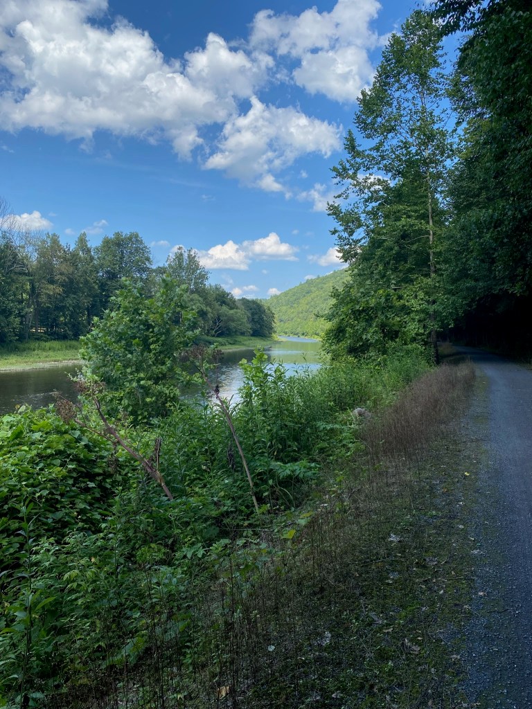 The valley that contains the PCRT is known as the “Grand Canyon of Pennsylvania” because Pine Creek cut a gorge heading to the West Branch of the Susquehanna River, which eventually flows down into the Chesapeake Bay. Like most other old growth forests that had railroads through them, this was clear cut in the late 1800s and was literally barren in the early 1900s. The resulting ecological damage took more than 50 years to undo, but thanks especially to the conservation efforts begun in earnest in the 1950s (all this great stuff you learn from reading the signs on the trail!) it has recovered well into a full second growth forest. It’s quite remote and begins in the city of Jersey Shore (interesting actually named after the shore in NJ – read the Wikipedia article) and heads north ending at Wellsboro. Unfortunately for bikers and fortunately for rail buffs, the railroad still runs north from Wellsboro as a tourist line in order to maintain the tracks in case they ever want to restart freight services. This is a weird byproduct of how rail rights work as outlined in the rails to trails book that talks about how complex the legalities around converting rails to trails is. It’s really too bad because the trail could go all the way to the finger lakes region pretty easily and make a really nice off road multi-day trip.