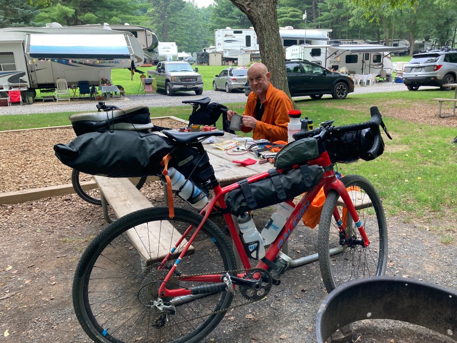 We got up and made breakfast – Bran Buds and water for me, oatmeal for Charles – got kitted up and took a bunch of stuff off the bikes for our long day. We left the tents set up, and took all unnecessary bags off the bikes (seat/handlebar) that were not needed for just a day ride. I kept my frame bag on because that had on bike food and repair equipment that might be needed and I left the Salsa handlebar cradle on because it’s just not worth taking it off. So we definitely were “lighter” for a hilly ride day. Charles originally mapped out a route that was maybe 85 miles, but after a number of sweet gravel hills, we decided it was appropriate to cut the hilly section to Wellsboro a little shorter. While I had a lot of miles in my legs at that point in the season, he did not. The climbs were on the hills were 5-8% and since my gearing is a bit higher than Charles I had to go a bit faster. I may go down from a 38 to a 36 front chain ring for this kind of hilly stuff in the future.