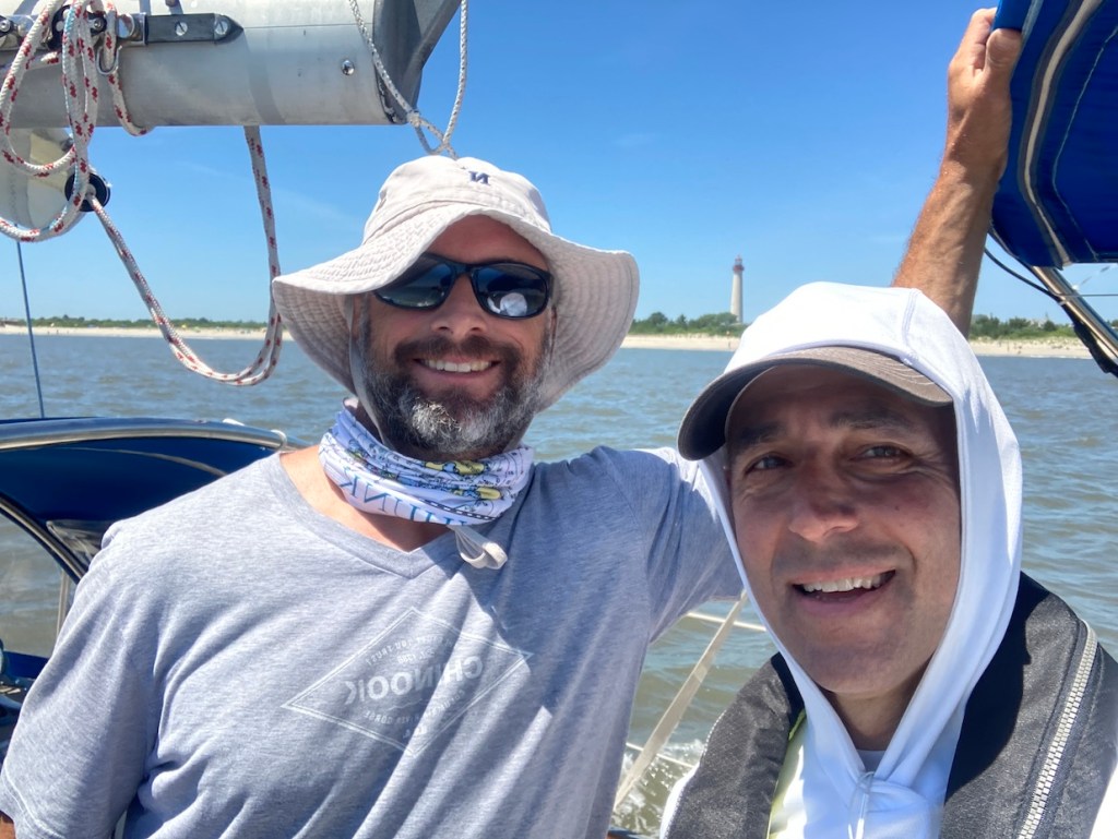 The breeze after daybreak built and we had a great sail almost all the way to Cape May with a good 1-1.5 knot current boost. We had to motor over to Cape May and took the inside line right up against the beach, but once past, were able to set the kite and start the fantastic sail up the New Jersey coast (the above video). The forecast was for 15-20 knots from the south building to 25-30, so we knew we would have a great run up to Ambrose Light and into New York Harbor.