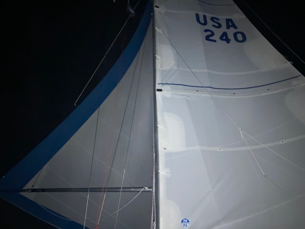 As the evening progressed, the breeze built to the expected 15-20 and at dusk we dropped the kite and put the jib out wing and wing just to gear down a little. I got a few one hour chunks of sleep during the day and evening and about 11:30 we jibed from starboard to port (of course being hailed by a cargo ship right in the middle to insure we gave them plenty of room – we did and would have without their hail) but once the jibe was over, Jesse went below and I stood the graveyard shift. Things were very stable with the breeze never getting higher than the low 20s but the ocean swells were building and the surfs were getting ever faster 8, 9, 10, 11+ knots! Not bad. The new autohelm he named Starbuck did a great job despite the Tartan 37’s IOR inspired pinched in rear end. I had to keep a good lookout and had to alter course just a few times just to give shipping traffic nice wide berth.