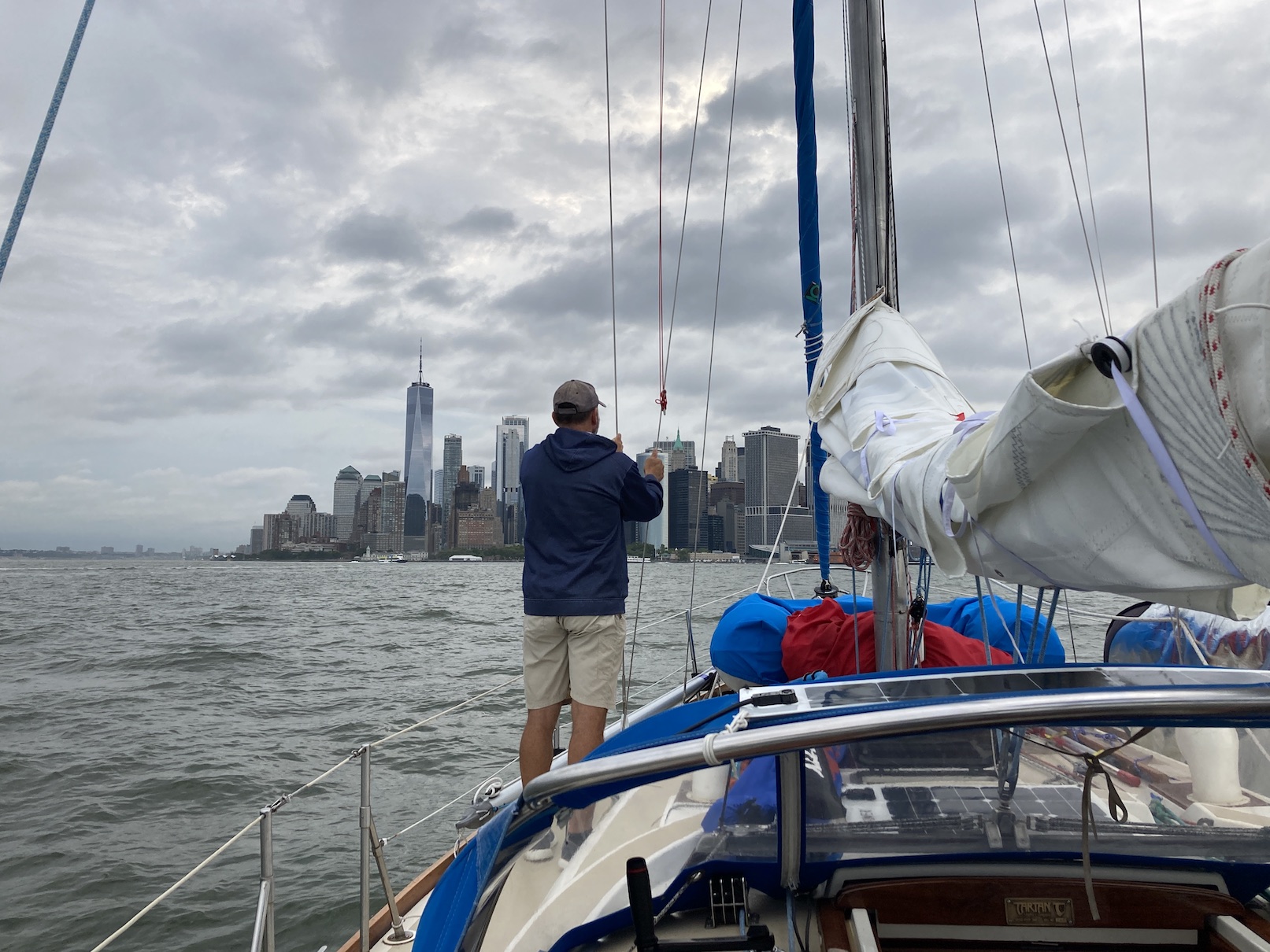 At first light we saw the tell tail Varrazzano-Narrows Bridge lights and we took the jib down and beam reached into New York harbor. I was dead tired by this point so laid down for an hour and a half for a much needed nap, but work refreshed as we went under the bridge.
