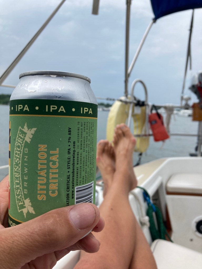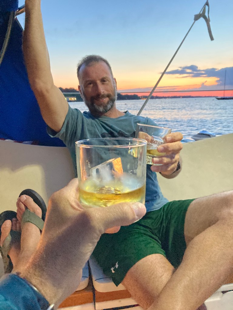 Jesse went below to nap while I took us through the river and I had to wake him when we got to Manhasset Bay. We cleaned things up and I had a much anticipated couple of 10am IPAs. We relaxed and crashed for a few hours. It rained most of the day and we just chilled on the hook, having a simple sunset dinner as the rain moved away and hit the sack early.