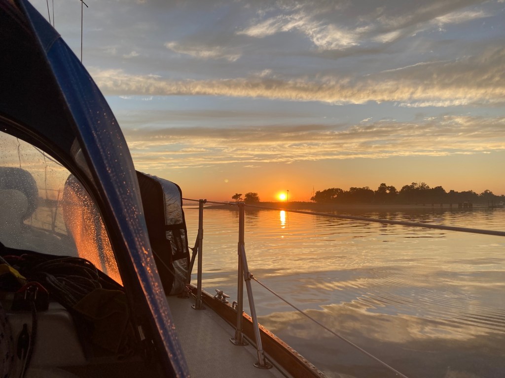 Our plan was to stop midway in the canal at the Summit North Marina for the night and leave at 3am just before the tide turned. We had a nice dinner at the restaurant there and hit the sack ready for the early morning. We bucked a little current in the first hour but once it turned we had a good boost out the canal and down the bay and we were greeted with a beautiful sunrise.