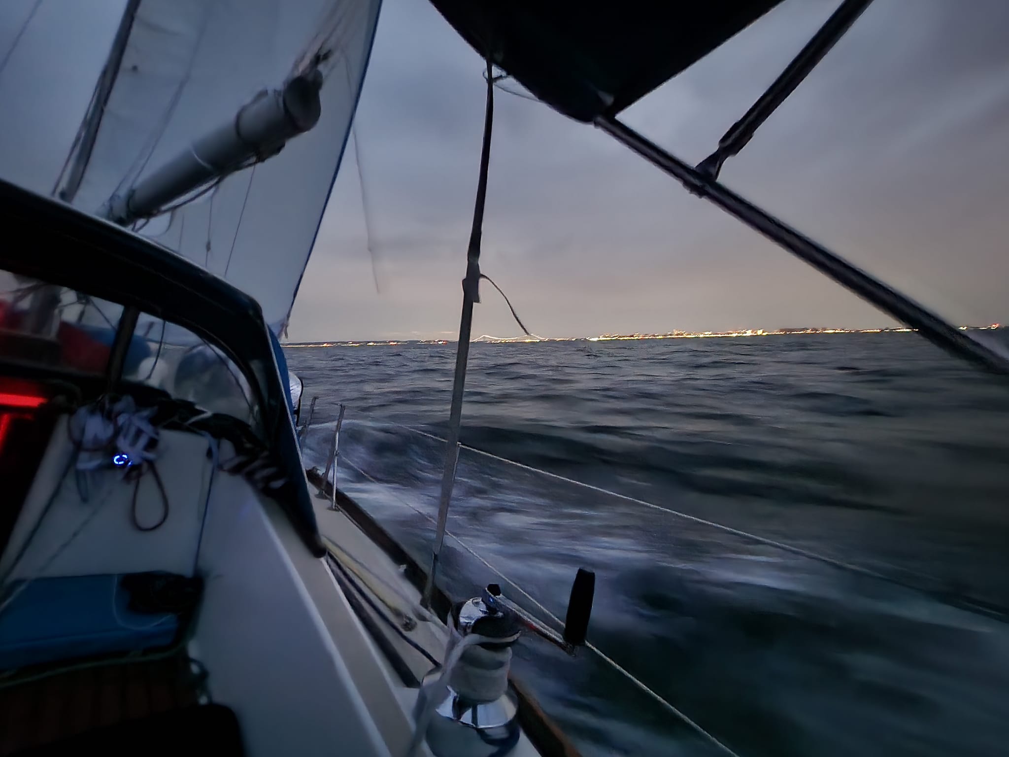 The breeze after daybreak built and we had a great sail almost all the way to Cape May with a good 1-1.5 knot current boost. We had to motor over to Cape May and took the inside line right up against the beach, but once past, were able to set the kite and start the fantastic sail up the New Jersey coast (the above video). The forecast was for 15-20 knots from the south building to 25-30, so we knew we would have a great run up to Ambrose Light and into New York Harbor.