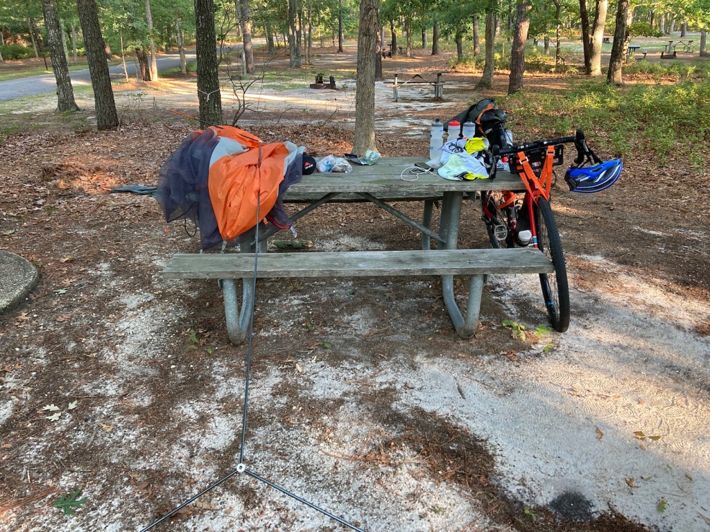 I was quite surprised for the end of August that all of these were essentially empty. Redden especially as I only saw one other person and no staff. That’s not surprising as it was “primitive” only (just a camp spot with a porta potty and no potable water). But it was quiet. The New Jersey spots all had flush toilets and showers near the sites (the showers were really appreciated!) and several had basic laundry (remember to bring a few detergent pods!!!). But the spots were all very nice and I quickly settled into a routine of arrive, check in, unpack, set up the tent, clean up/shower, rinse kit, cook some dinner listening to a podcast, get in the tent and read and try not to fall asleep until it gets dark. Fortunately it was cool at night, often starting in the low 80s, but dropping to the high 60s by sunrise. Really nice sleeping weather. It did thunderstorm several nights but I was ready for them and now have a better sense for where to locate the tent and how to deal with packing it up in the morning when wet.
