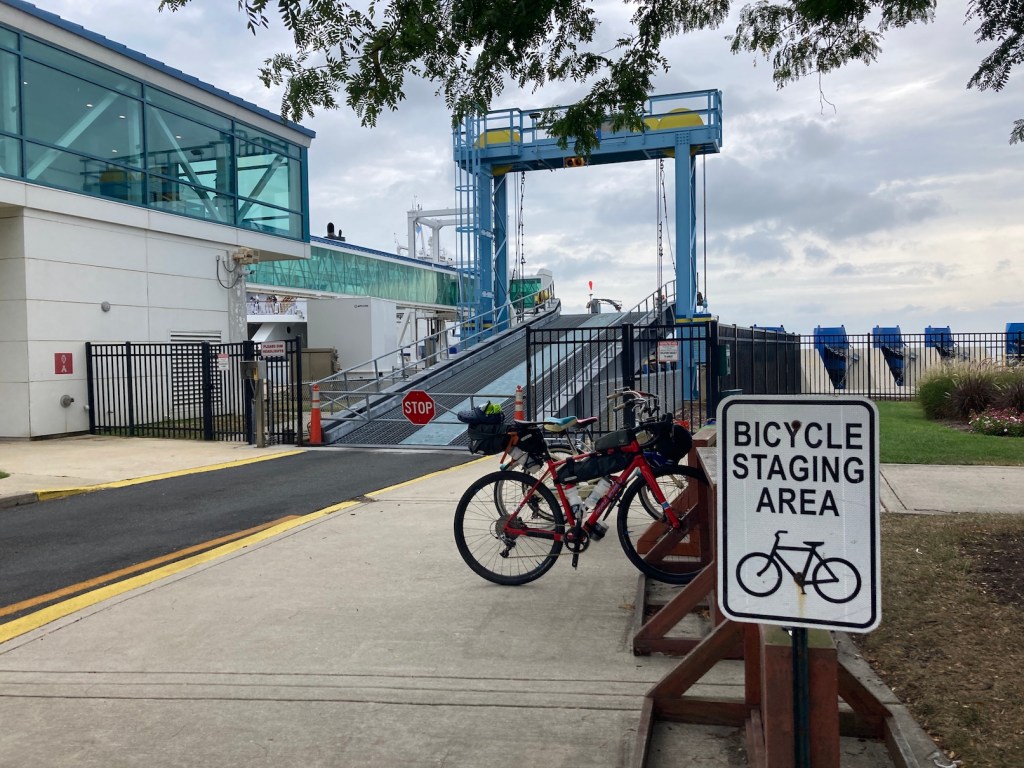 I got to Lewes pretty early on Monday, got some coffee at a local shop and just hung out on the main street to observe the scene. Interesting that Lewes calls itself a bicycle friendly city. My bike was leaning against the bench and not blocking the sidewalk. Almost no one here. A city guy tells me not to lean my bike against the bench and that’s why they have bike racks. A block away with no bench close…. Basically designed by someone who has never ridden a bike. He said “next year you’ll get a ticket” to which I replied “thanks, that’s a nice reminder not to come back.” I’m not one for in situ snappy comebacks, but the caffeine had just kicked in. I went to the ferry terminal, got my ticket and chatted with a few people on beach cruisers heading to Cape May for the afternoon. The car ferry and terminal are a pretty big operation, much like that of the ferry to Martha’s Vineyard. I guess it does save a ton of driving to get to New Jersey. The ferry ride was quite refreshing as the heat of the day increased.