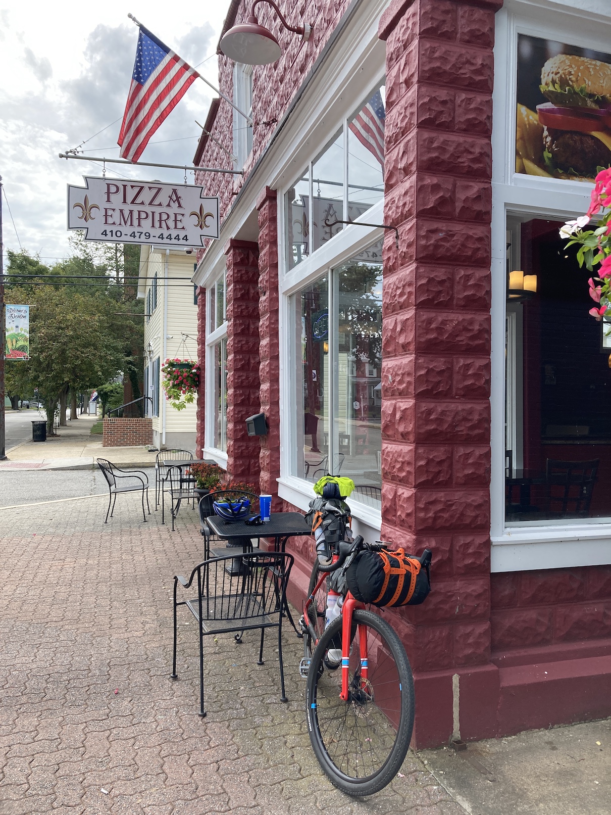 The route to Redden zig zagged through eastern shore farms on low trafficed roads, all in all a pretty nice rural ride. As soon as I got off Kent Island, I had about 2 miles on Rt 50, and as luck would have it, I flatted because of crap on the shoulder. I stopped quickly, pulled out the nail and got a dart in the tubeless tire before it completely deflated. In retrospect, I did not do it correctly (the dart material pulled out) but it was small enough that the sealant plugged the hole, although I had to continue to add air over the next few days. I was worried about it the entire ride, but it ended up not being an issue. Love tubeless tires! Because I knew there was no potable water at Redden and I did not time my last stop well, I had to deviate 8 miles round trip out of the way down US 113 to Georgetown MD to a strip mall to get enough water for cooking. So the day ended up being a little longer at 72 miles, 5:01 pedaling time, 6:54 elapsed and only about 900′ vertical. There was a light SE breeze but it was never an uncomfortable headwind, and the last hour or so it sprinkled, but it never rained much, however it did thunderstorm overnight.