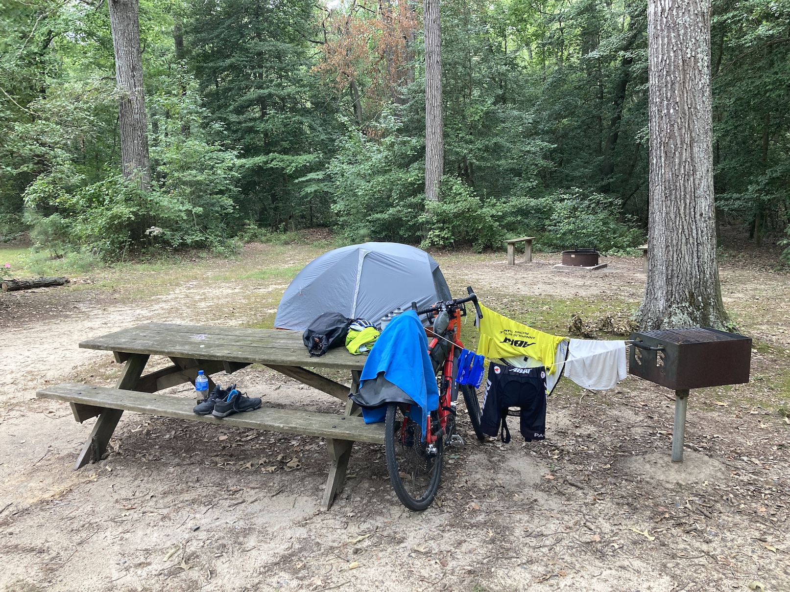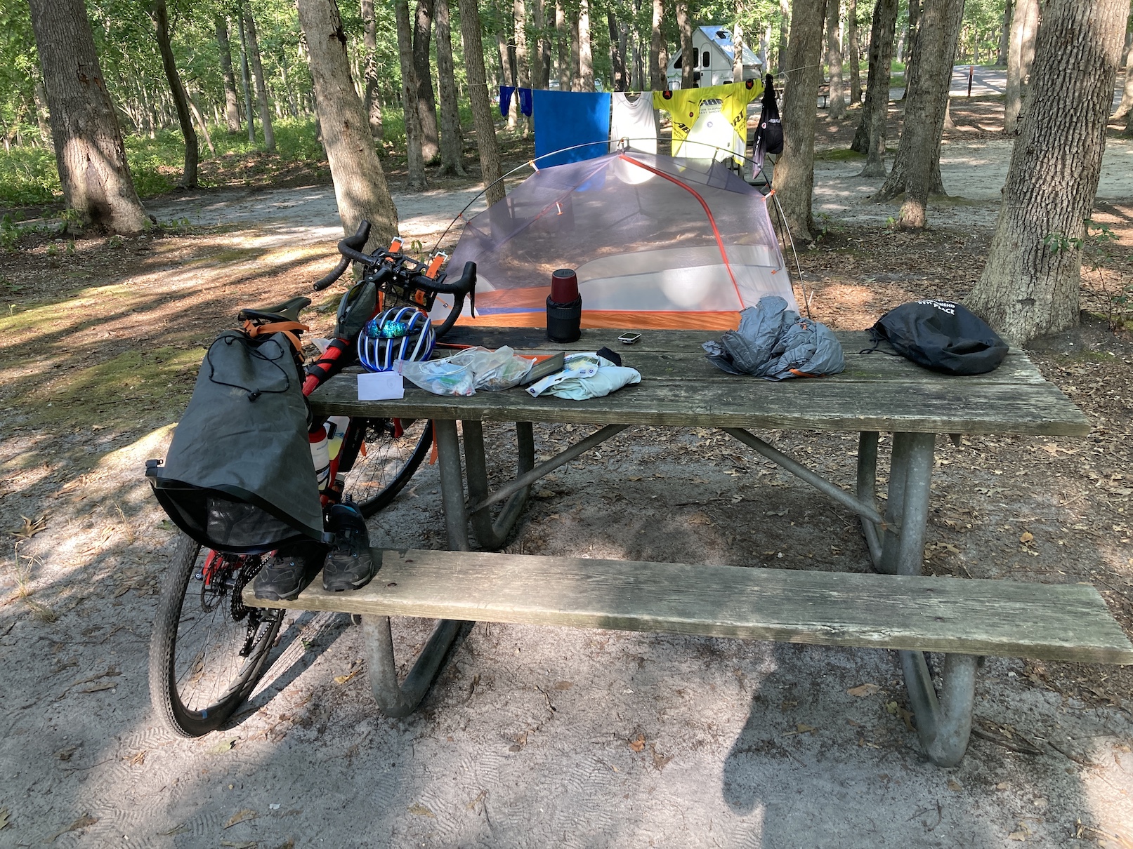 I was quite surprised for the end of August that all of these were essentially empty. Redden especially as I only saw one other person and no staff. That’s not surprising as it was “primitive” only (just a camp spot with a porta potty and no potable water). But it was quiet. The New Jersey spots all had flush toilets and showers near the sites (the showers were really appreciated!) and several had basic laundry (remember to bring a few detergent pods!!!). But the spots were all very nice and I quickly settled into a routine of arrive, check in, unpack, set up the tent, clean up/shower, rinse kit, cook some dinner listening to a podcast, get in the tent and read and try not to fall asleep until it gets dark. Fortunately it was cool at night, often starting in the low 80s, but dropping to the high 60s by sunrise. Really nice sleeping weather. It did thunderstorm several nights but I was ready for them and now have a better sense for where to locate the tent and how to deal with packing it up in the morning when wet.