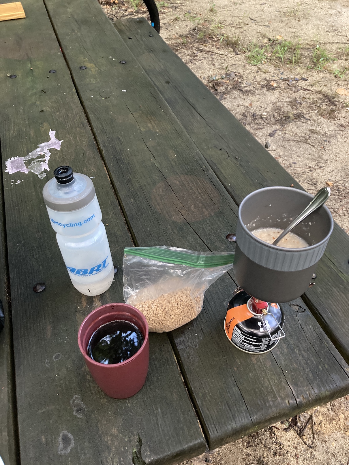 For food, I brought 4 Backpackers Pantry dehydrated meals for dinners, instant oatmeal sprinkled with Bran Buds cereal and Starbucks instant coffee for breakfast. In general that was very sufficient food (quality and quantity) and during the days, I stopped for lunch on the road. I never felt really full, but never felt like I was lacking. A really good mix. I am also not using any Heed or other “performance powders” in my hydration routine riding as they are a PITA to carry and mix. I do bring Hammer Fizz electrolyte tablets to mix into water though and I did end up buying Gatorade at a number of stops as well as drank only full sugar cokes for lunch. The morning routine was similar, wake up, make coffee/breakfast, pack up, and roll. I was most often easily riding away from the campgrounds at 8am.