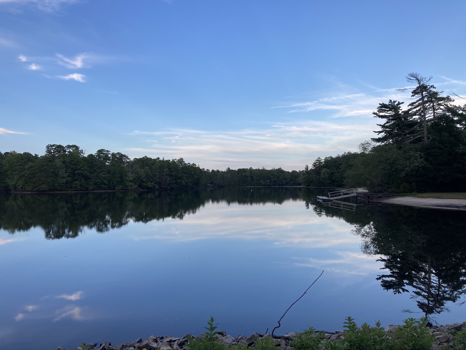 As I mentioned in the summary, the most unexpected part of this ride was going through some small towns and being in the heat of the Pinelands”. For the last 20 miles to Bass River State Forest the look and smell is very much like riding on Cape Cod, with sandy soil, pine trees and little lakes. When I got close to the campground I stumbled on the Lower Bank Tavern and decided on a whim to pull in and grab a beer realizing I could easily do the last 6 miles with a beer in me. It’s always a little awkward walking into a local place all sweaty in spandex (especially in rural areas where one does not see that kind of thing often), and this was no exception. You know, everyone at the bar stops talking and stares at you. Definitely some looks but after a few minutes a guy came over and started chatting about bikes. Turns out it was the owner Billy who rides a lot and has raced a bunch. After chatting for a while he took me out to his garage to show me his quiver of bikes (Colnagos for racing, an older Nishiki for randonneuring. a full suspension MTB and a few other random bits). Super nice guy. If you are every in the area, stop in for food and beer. Unfortunately, I didn’t get any pictures as I was just enjoying myself. Glad I stopped! If it were just a little closer I would have gone back there for dinner, but I was beat after 70 miles and 4:55 pedaling time, 7:23 elapsed. I rode way faster than I typically do bikepacking, but the tailwind helped. I hate riding on those highways, so rode as fast as possible to get it over with. It took its toll though. Like the evening before, I walked around the grounds to check out Lake Absegami and stretch my legs.