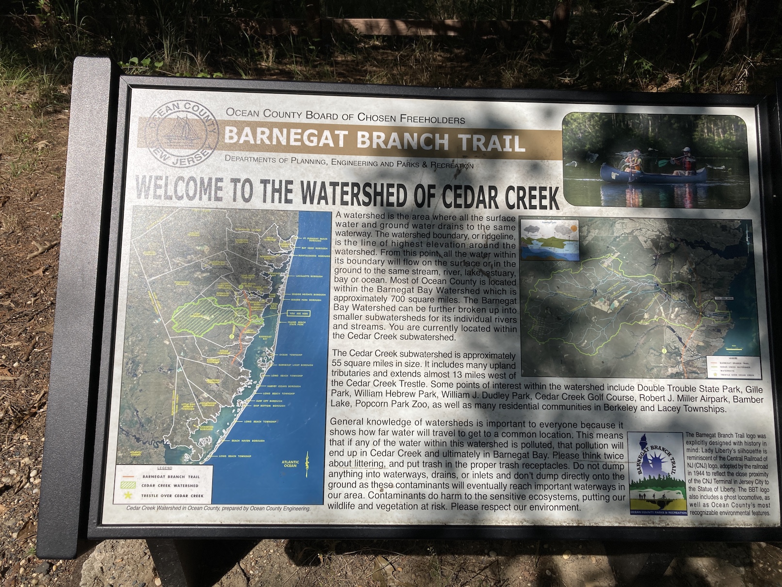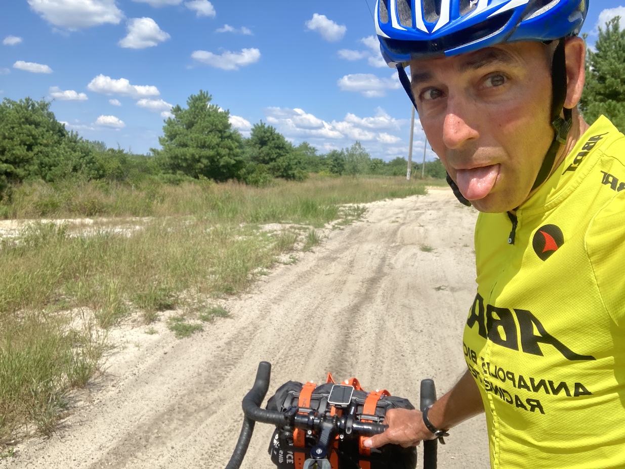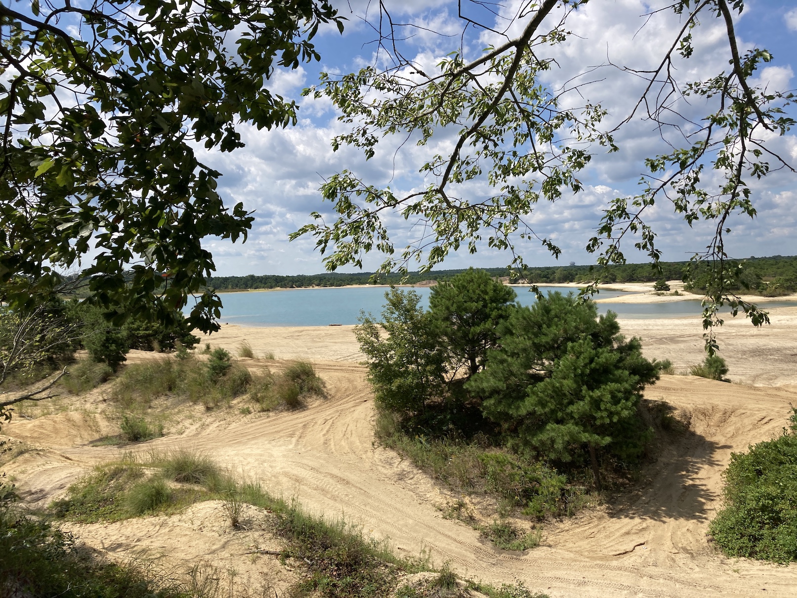 What was, on paper anyway, a pretty straight forward route north on US 9 to Toms River for the first half of the day went a little sideways after the track went onto the Barnegat Branch Trail. US 9 was quite nice with a big shoulder and I cruised up through the various townships (Stafford, Ocean, Berkeley) until the turn onto the trail that more or less paralleled US 9 to the west. As I said, I never sanity checked the route on RWGPS and I should have. First there was a missing section with some easy single track; not expected but easy enough. Then it went right through a sand mine. I knew something as a little off when I saw a sign “You are now entering an active mine.”, but thought meh, I’ll see what it brings. I thought I was good when I came to a county gate and pressed on. Oooops. I ended up basically in a sand trap with 4″ deep sand. I tried to ride through it, but didn’t make it very far. After checking with Google Maps Satellite View, my choice was a mile through the woods to US 9 or a mile through the sand to where the trail picked back up. I decided to just hike-a-bike through. Fortunately I only had to walk about 10 minutes before I could remount and in that time, I came across a quarry lake with some nice shade to rest. After getting back on the trail, I was basically in Toms River.
