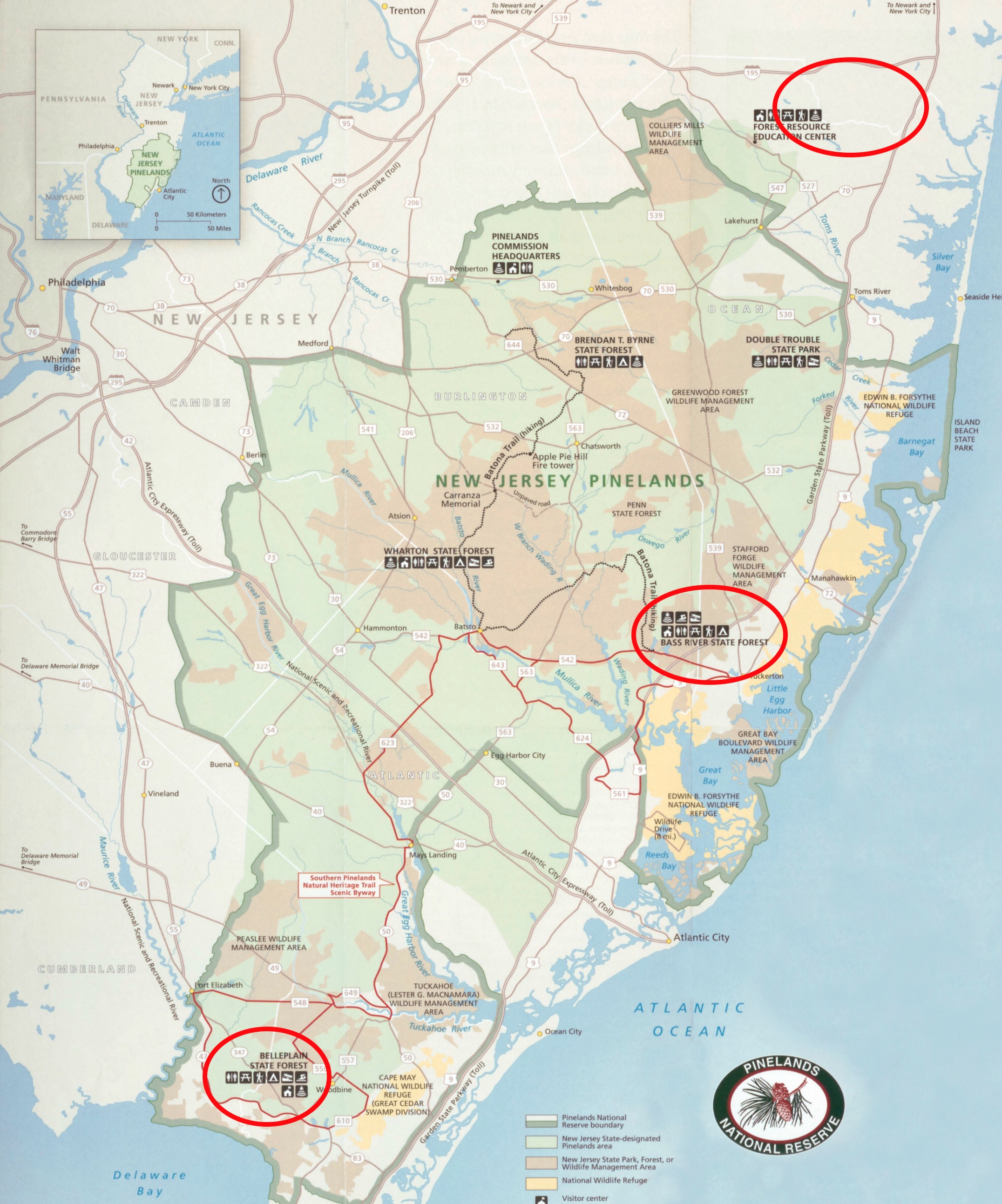 The most amazing find for me was the “Pinelands” or more accurately, the New Jersey Pine Barrens. This area was the real gem of the entire trip. I’ve been many places in New Jersey but they always are clustered on either side of the state, the shore beaches or stuff along the I-95 corridor. But the section between the NJ Turnpike and the Garden State Parkway is amazing. It looks and smells very much like Cape Cod, with sandy soil, pine trees, little lakes and river deltas but is significantly flatter. The roads were quiet and scenic and mostly the pine smell reminds me of New England, something near and dear.