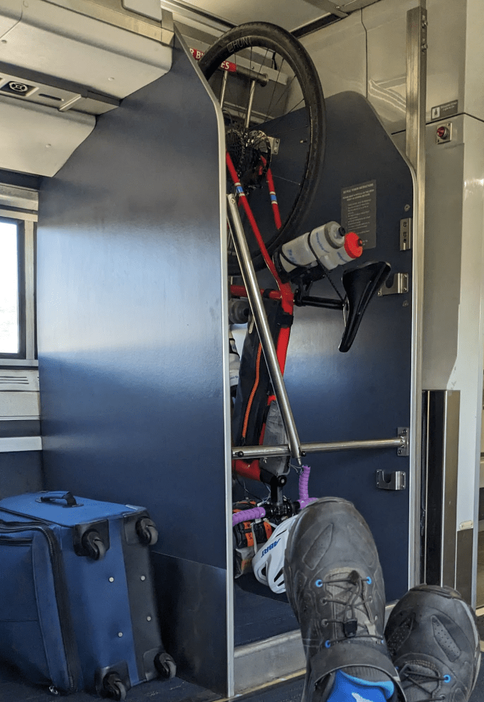 I had watched a few videos of how to work the bike rack on the train so I was prepared. I removed my rear and front bags from the bike so was ready to put the bike in the rack. Based on advice, I left the front wheel on until after boarding. There was a decent amount of dwell time once aboard so I got the wheel off and the bike into the rack before we departed, then got myself situated for the 7 hour interlude.