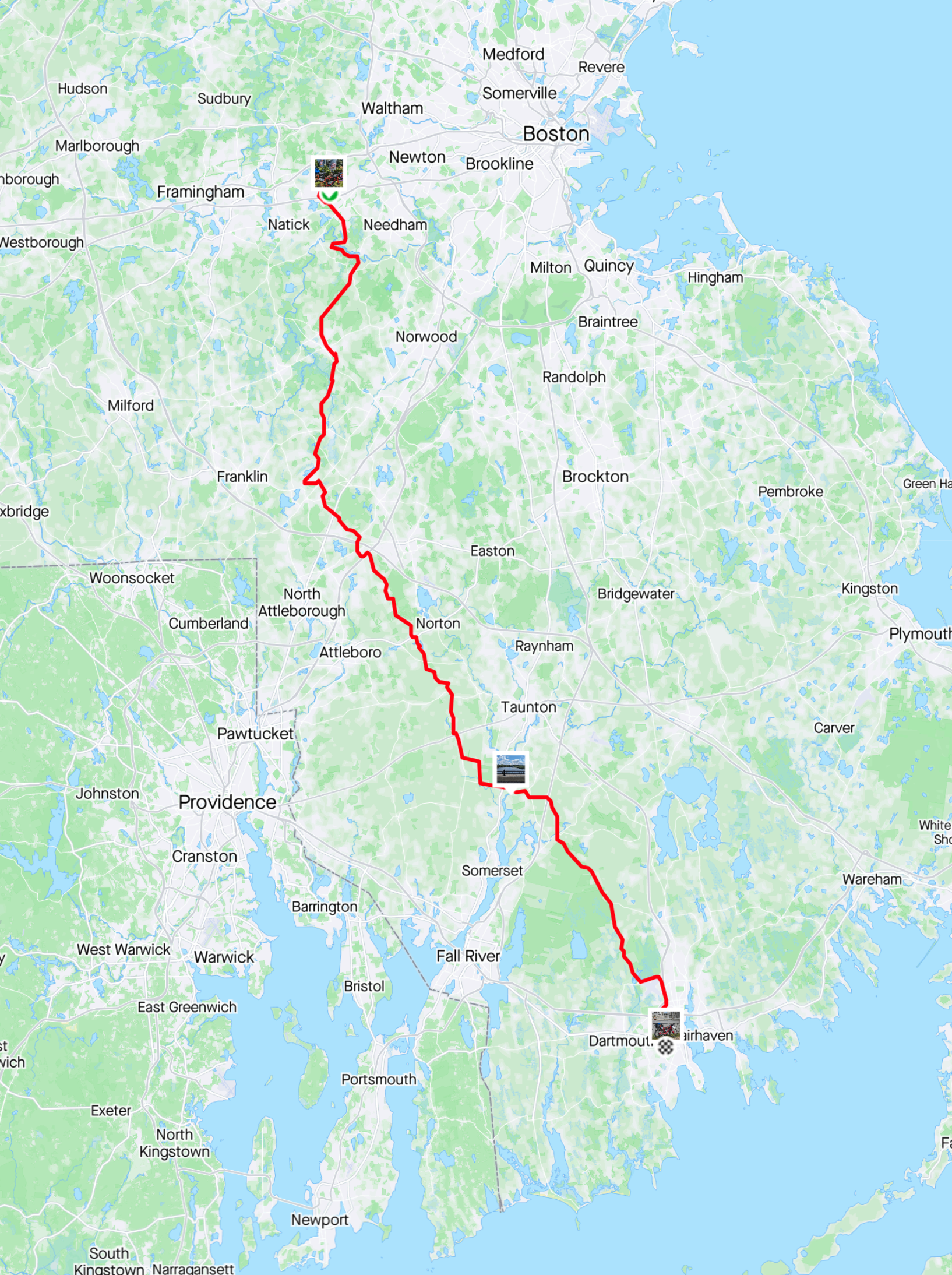 It was a lot of fun but the next day, I was again feeling the itch to get on the road. It’s interesting that when you get into this rhythm it counterintuitively feels unsettling to stop for very long. The next day – this was riding day 12 (Strava) – I packed up, put my father’s address into Google Maps bicycling directions and got what ended up being a fantastic route through the southwest Boston suburbs and some semi rural areas north of New Bedford. Jenny suited up and rode with me for about the first 20 miles – the route largely used for the Pan Mass Challenge she has done a number times and is her usual day ride route – at which point I continued on solo.