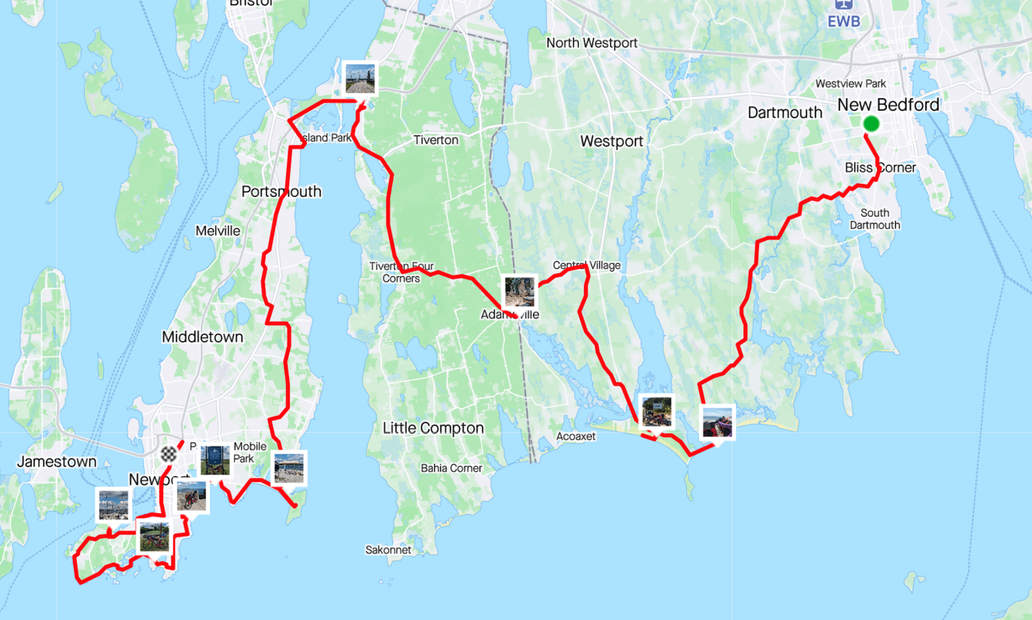 Once again, I was antsy to get moving and enjoy the open road solo. Riding day 13 (Strava) was from New Bedford MA to Newport RI to see Lexi and Andres. I know this route pretty well, but again used Google Maps cycling directions with some explicit wandering through my favorite local riding areas of South Dartmouth and Westport, notably Horseneck Beach. Again, another spectacular day in southeastern new England which only fueled my age induced nostalgia!