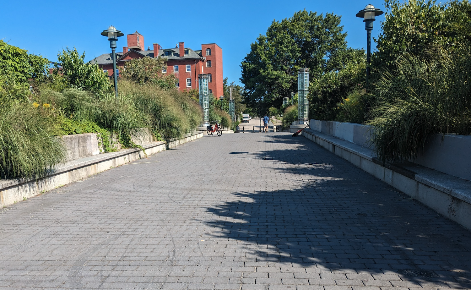 The worst part of the trip and the one that made me the most anxious was the Mt Hope Bridge that connects Aquidneck Island to Bristol. I’ve driven over it a number of times and it’s a high, narrow two lane bridge with a really bumpy surface and it seemed a bit sketch to ride over (“sorry officer, I never saw the no bicycles signs”). It turned out not to feel as steep as I thought it would and it only took me about 2 minutes to get up the hill at 13 mph and I flew with traffic on the way down.