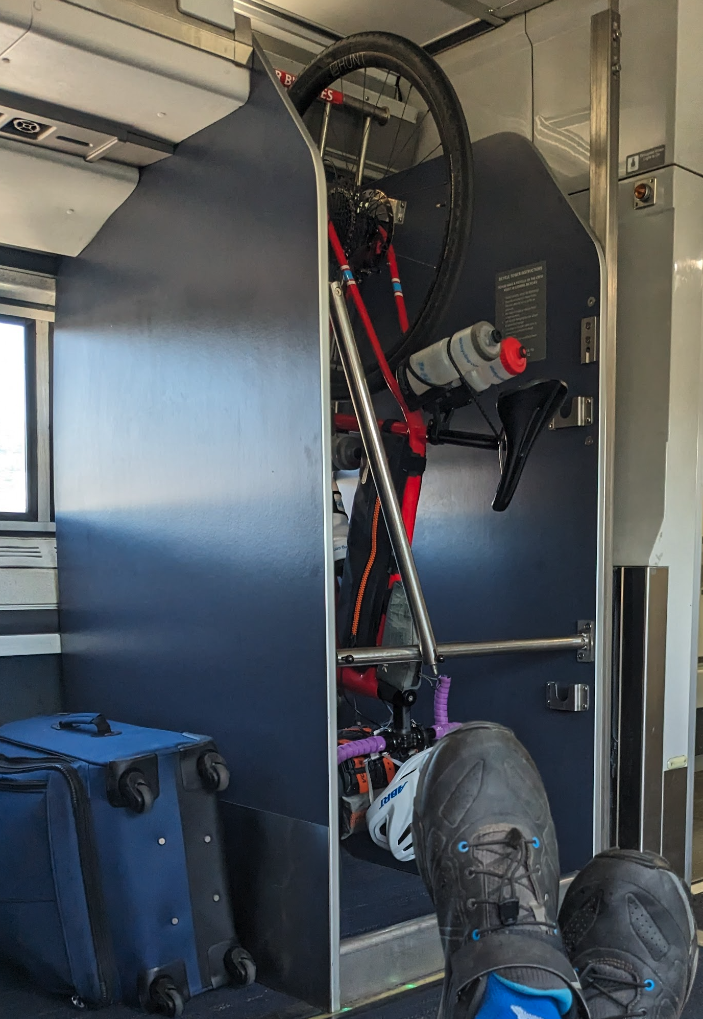 I had watched a few videos of how to work the bike rack on the train so I was prepared. I removed my rear and front bags from the bike so was ready to put the bike in the rack. Based on advice, I left the front wheel on until after boarding. There was a decent amount of dwell time once aboard so I got the wheel off and the bike into the rack before we departed, then got myself situated for the 7 hour interlude.