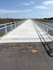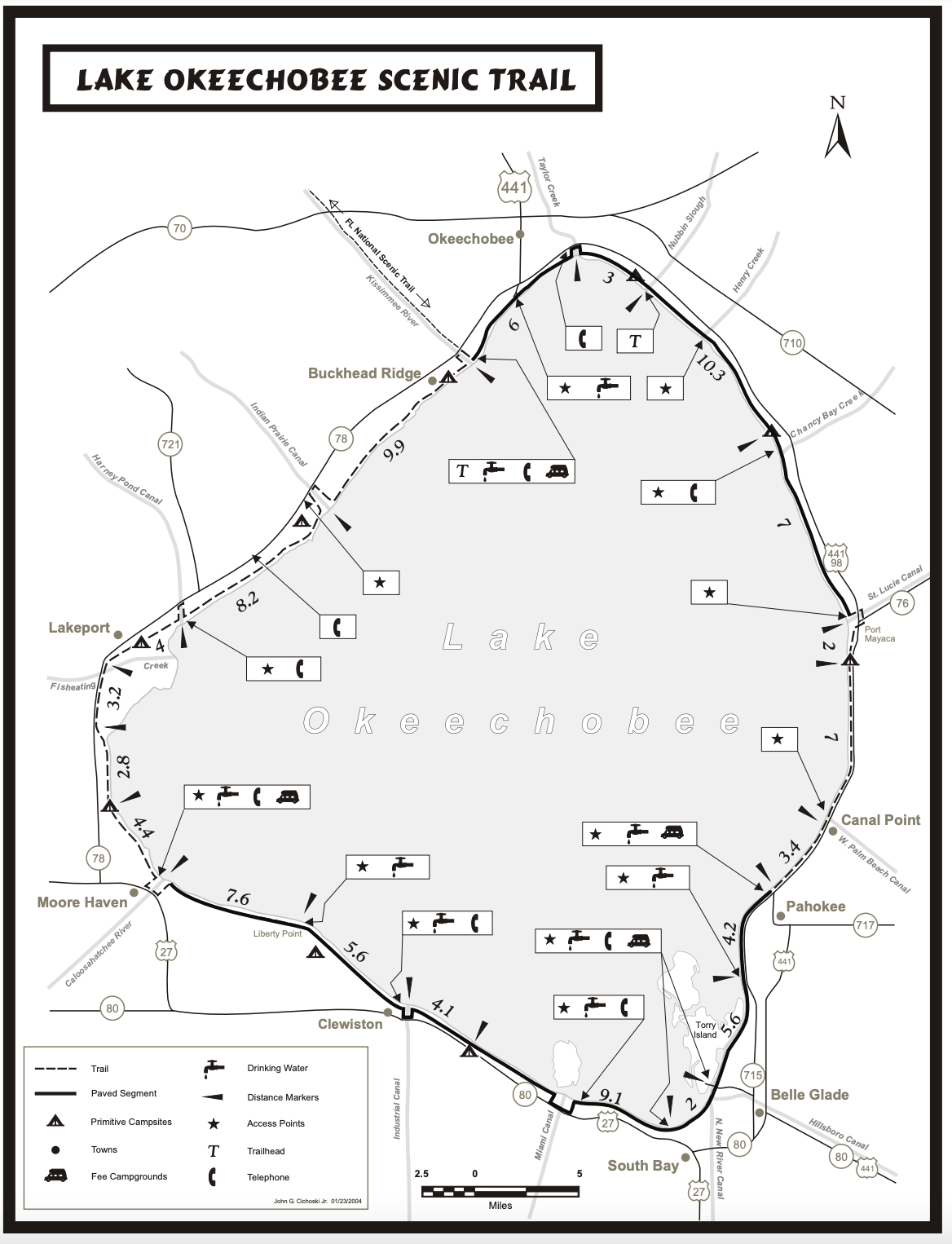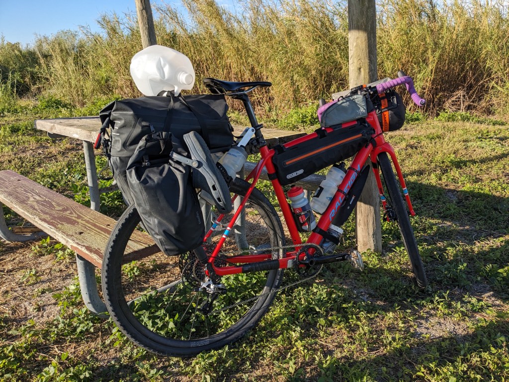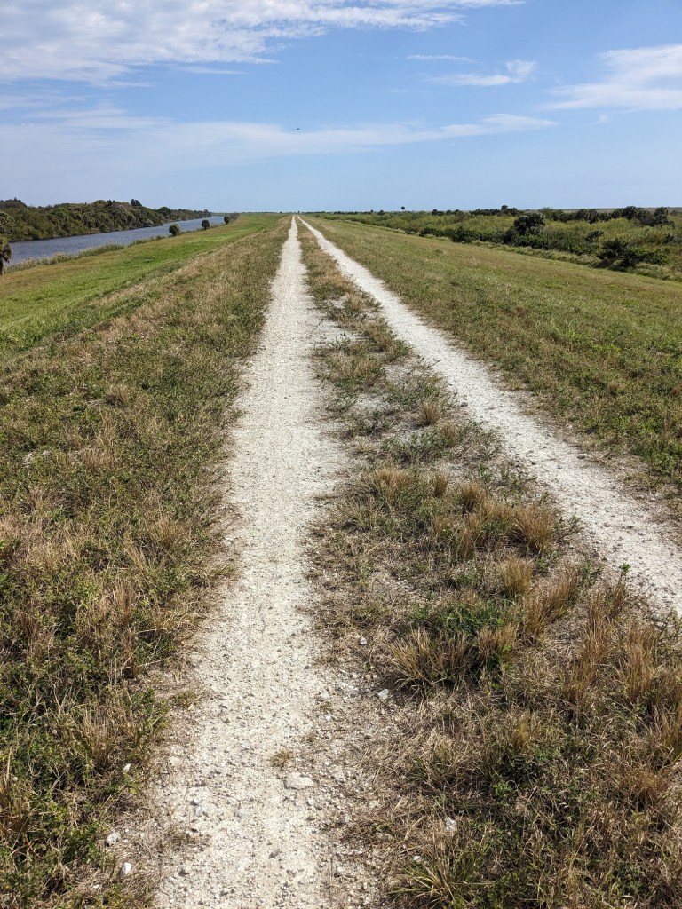 The basic route is a trail along the Herbert Hoover Dike that surrounds Lake Okeechobee. Like most regional trails, it has several other names, the Lake Okeechobee Scenic Trail (LOST) and the Florida Trail (it’s a part of that longer trail from Pensacola to Miami). It’s about 120 miles and as of today – despite what the Army Corps of Engineering’s website says – is 100% open, except for a locked gate that you can easily get around to get back on the trail after crossing a canal. The trail surface is roughly 60% paved and 40% gravel (more or less crushed limestone, with a few chunky bits) and you could easily do it on a road bike with virtually any tires, after all we used to do much gnarlier stuff in Loudoun County on road bikes in the ABRT “old days”. It’s pancake flat, except for two high level bridges over major canals and on/off ramps around minor canals. So you gotta pedal the whole time.