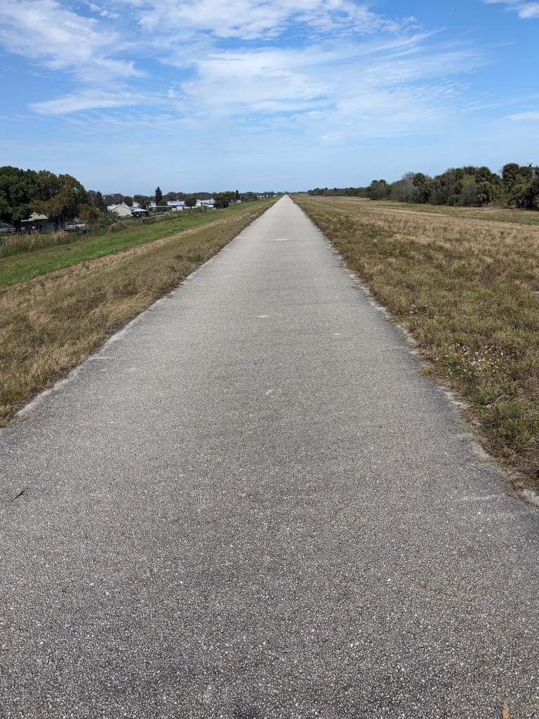 The route is not unlike a Florida version of the Gap/C&O: long and the appearance of being very straight, even though there are significant gentle curves, and while there are only subtle changes in scenery that some might find monotonous, there’s a lot to see if you look closely. The trail is basically an access road for the Army Corp of Engineers for maintenance of the dike and water management infrastructure and as such there are no facilities, bathrooms or water of any kind other than the lake. It’s very remote and even the surrounding towns are very rural in nature. It’s basically farmland with a few RV parks and rural houses on canals. Additionally, since it is up on a flood prevention dike, there is zero shade (there are a few covered benches depending on where you are).