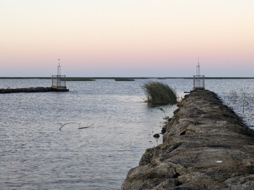 A strong northerly held the second part of the first day and the first part of the second day, so I rocketed down the eastern side of the lake. At the stop point, I considered continuing on with the wind, but was getting tired, so stopped at about 60 miles and set up camp about 4pm. I chilled for an hour or two reading and made some Ramen noodles. I knew from the night before at Uncle Joes that right at sunset the mosquitos come out all at once in force so I was ready. Right on cue they came and I dove into my tent. Under the fly against the tent mesh was covered in hungry mosquitos. I was really worried what was going to happen when I inevitably had to get out of the tent in the middle of the night, cuz you know us old guys, but they had dissipated considerably by 1am. Other than being a long stint in the tent, basically 6pm to 7am when the sun came up, it was an uneventful night. I had really hoped to keep the fly off to be able to gaze at the stars, but it was quite cold at 50 degrees with some dew which I knew would come with the cold, so put it on when I set the tent up. It was also quite windy so needed it to attenuate the wind for warmth. I think I need to get a sleeping bag that has a lower minimum temp because at 50 degrees with long pants, a cycling jacket, and a nanopuff, I was just on the verge of being cold. But once the sun poked over the dike, it warmed up quickly and the bugs were not bad in the morning.