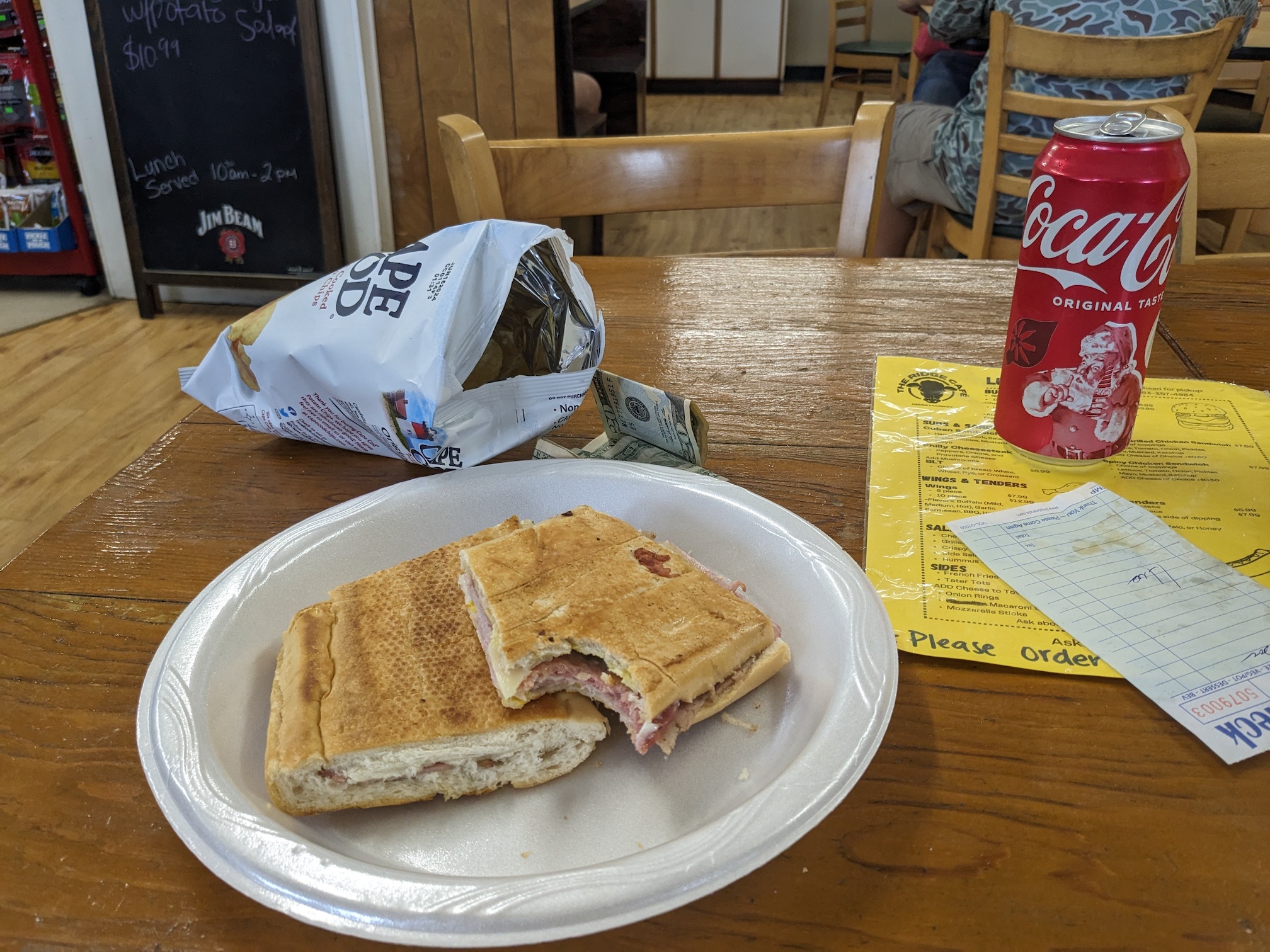 The day I got here, the breeze was howling from the southwest with an approaching cold front. The forecast for the next two days was perfect with the breeze shifting to W at the start of the ride, then gradually moving NW, N, NE over the next two days. I left Uncle Joes around 8:30a and planned on riding clockwise so this would be a crosswind for the first third of the day, shifting aft as I rounded the top of the lake. I stopped the Ridge Market near the connection to the Kissimmee River near the north end of the Lake. If you are ever in the area, they have an awesome Cubano sandwich!