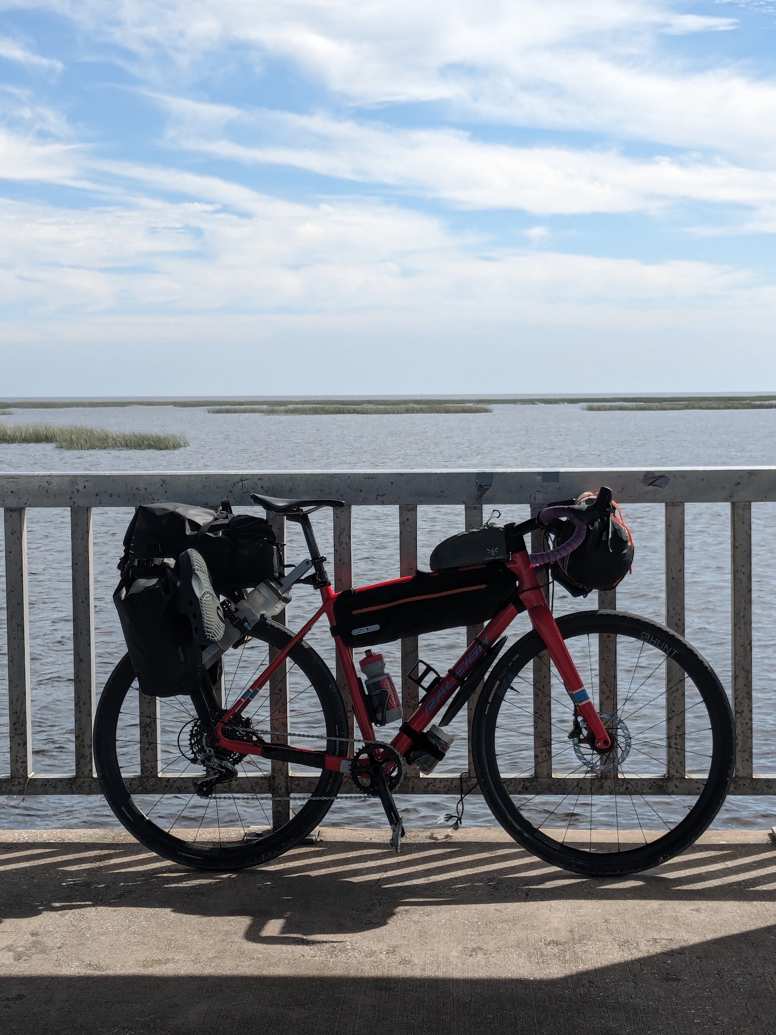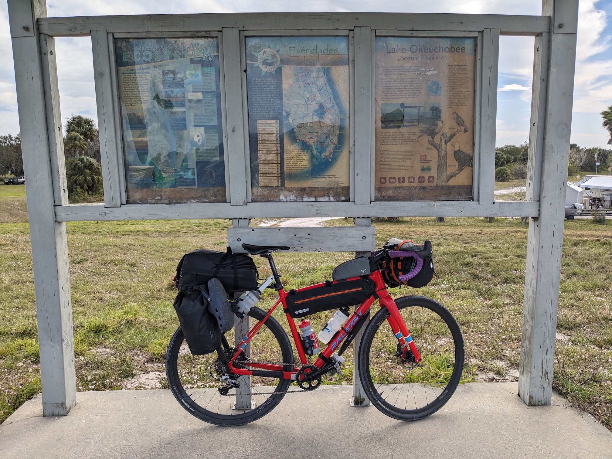 The basic route is a trail along the Herbert Hoover Dike that surrounds Lake Okeechobee. Like most regional trails, it has several other names, the Lake Okeechobee Scenic Trail (LOST) and the Florida Trail (it’s a part of that longer trail from Pensacola to Miami). It’s about 120 miles and as of today – despite what the Army Corps of Engineering’s website says – is 100% open, except for a locked gate that you can easily get around to get back on the trail after crossing a canal. The trail surface is roughly 60% paved and 40% gravel (more or less crushed limestone, with a few chunky bits) and you could easily do it on a road bike with virtually any tires, after all we used to do much gnarlier stuff in Loudoun County on road bikes in the ABRT “old days”. It’s pancake flat, except for two high level bridges over major canals and on/off ramps around minor canals. So you gotta pedal the whole time.