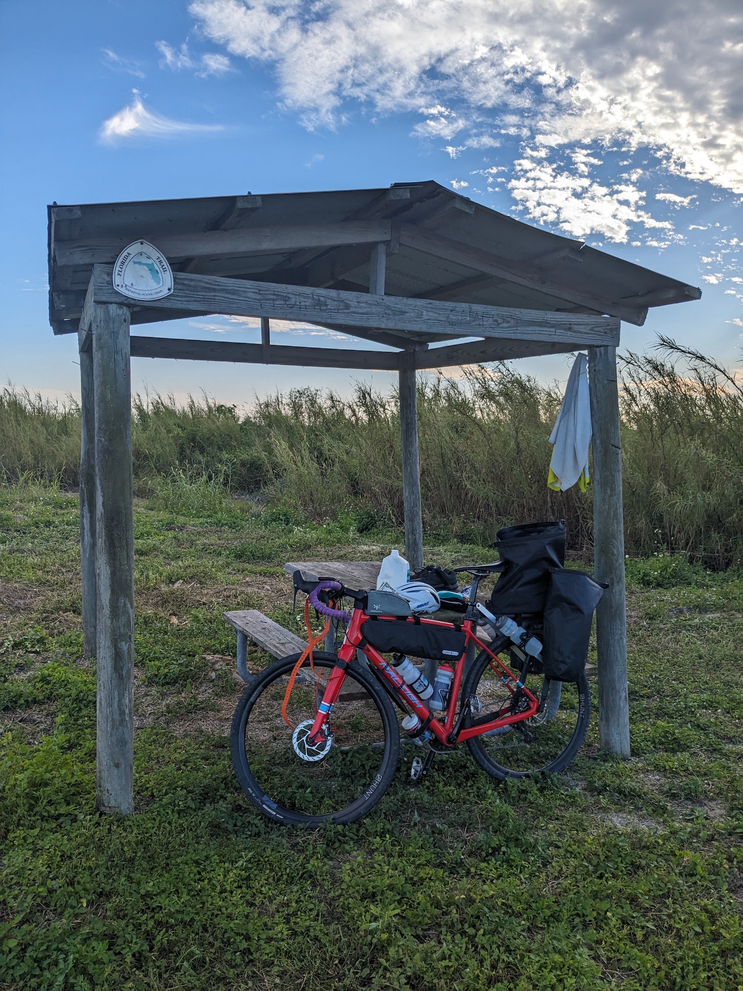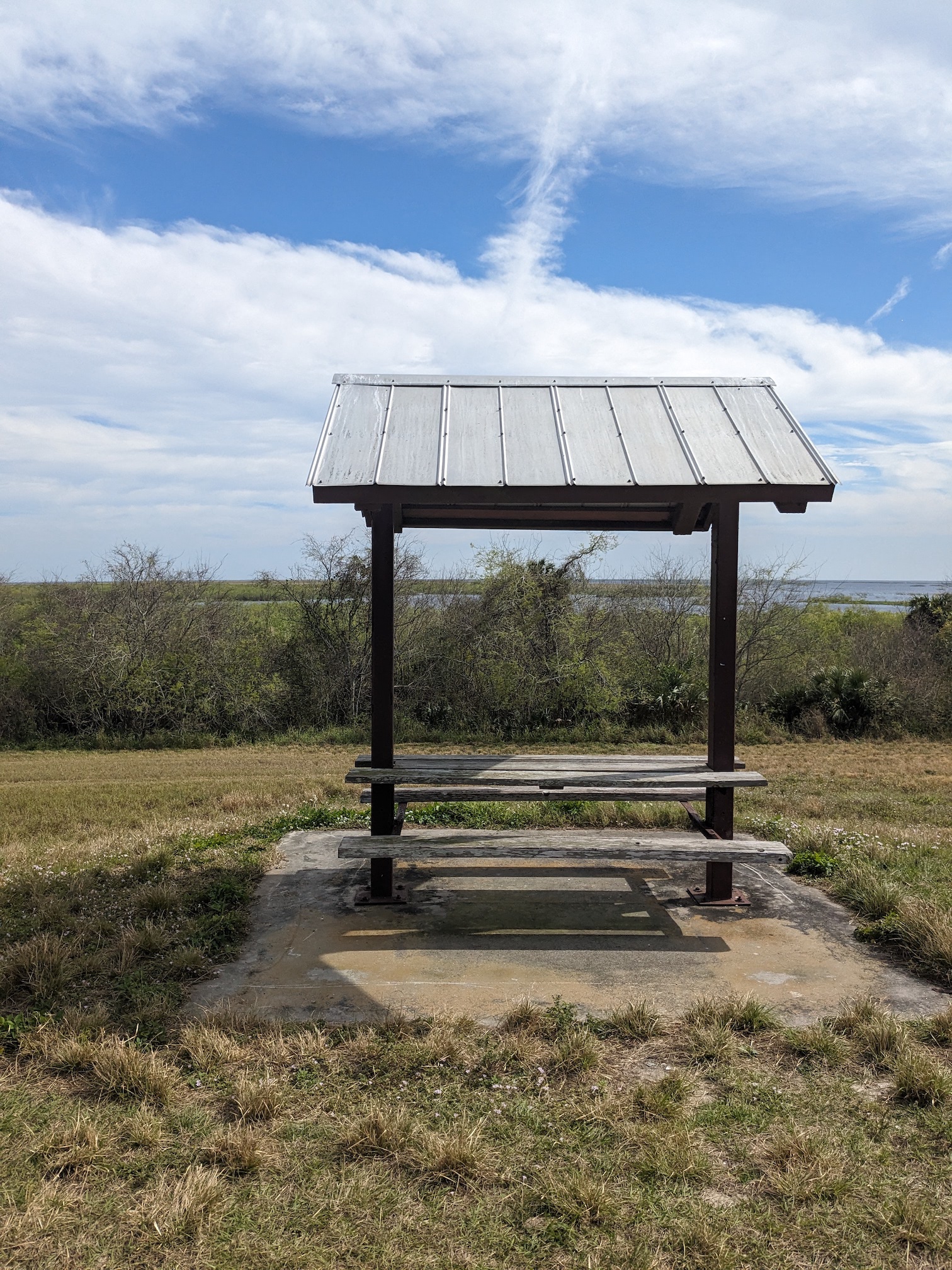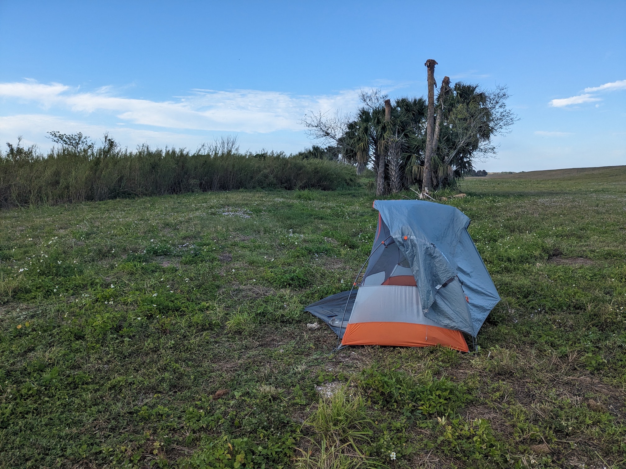 You could do it in one day during daylight hours (my moving time was under 10 hours) if you travel light and can carry 3-4 water bottles since resupply is not particularly easy. I decided to break it up into roughly two equal chunks of 60 miles and “wild camp” in the middle. As with past bikepacking trips, I’m always trying to do something new to broaden my experience base and figured I’d take advantage of the lack of services to practice some wild camping – just stop and pitch your tent at a suitable spot – carrying everything you need and dealing with no amenities like a shower or toilet. Nonetheless, it was hard to resist obsessively researching the area. The first thing was to find a place to park. There’s a little campground on the southwest side called Uncle Joes Motel & Campground (an “Old Florida” kinda place) and they have tent/van sites for $20/night. There’s a mix of long term residents, RVers and some transients, but it’s the perfect low cost, chill place. No reservations needed, just show up and pay. There’s a basic bathroom/shower and a little bar to get a beer. For my overnight, the Corps of Engineers has 13 “primitive” campsites that have a picnic table covered with a sheet metal roof and a fire pit so I marked them on my map and was prepared to stop at any one of them depending on how things went. I did stop at the one approximately half way around from where I started. This is decidedly different from what I have done in the past by staying at established campgrounds/RV parks. But that was the whole point.