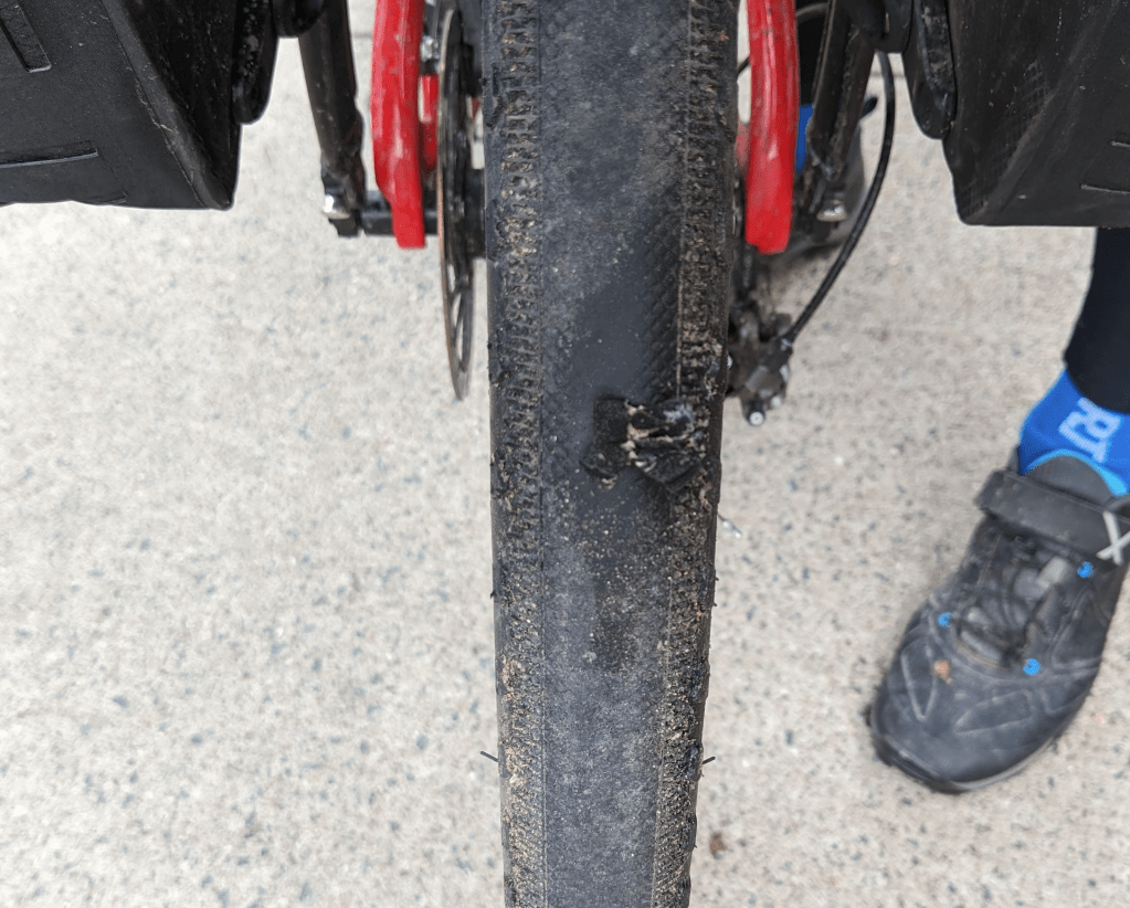 Crossing over the river there was a trail bridge out and we were routed on a temporary path made out of a jersey barrier. It had a lot of crap in it and when I stopped to take a picture on the bridge I must have run over something really sharp because I was spewing sealant out of my back tire when I got off the bridge, ironically 100 yards from the train station. I thought it might seal itself, but it was just a little too big, so I eventually got a dart into it and pumped it back up. All good.