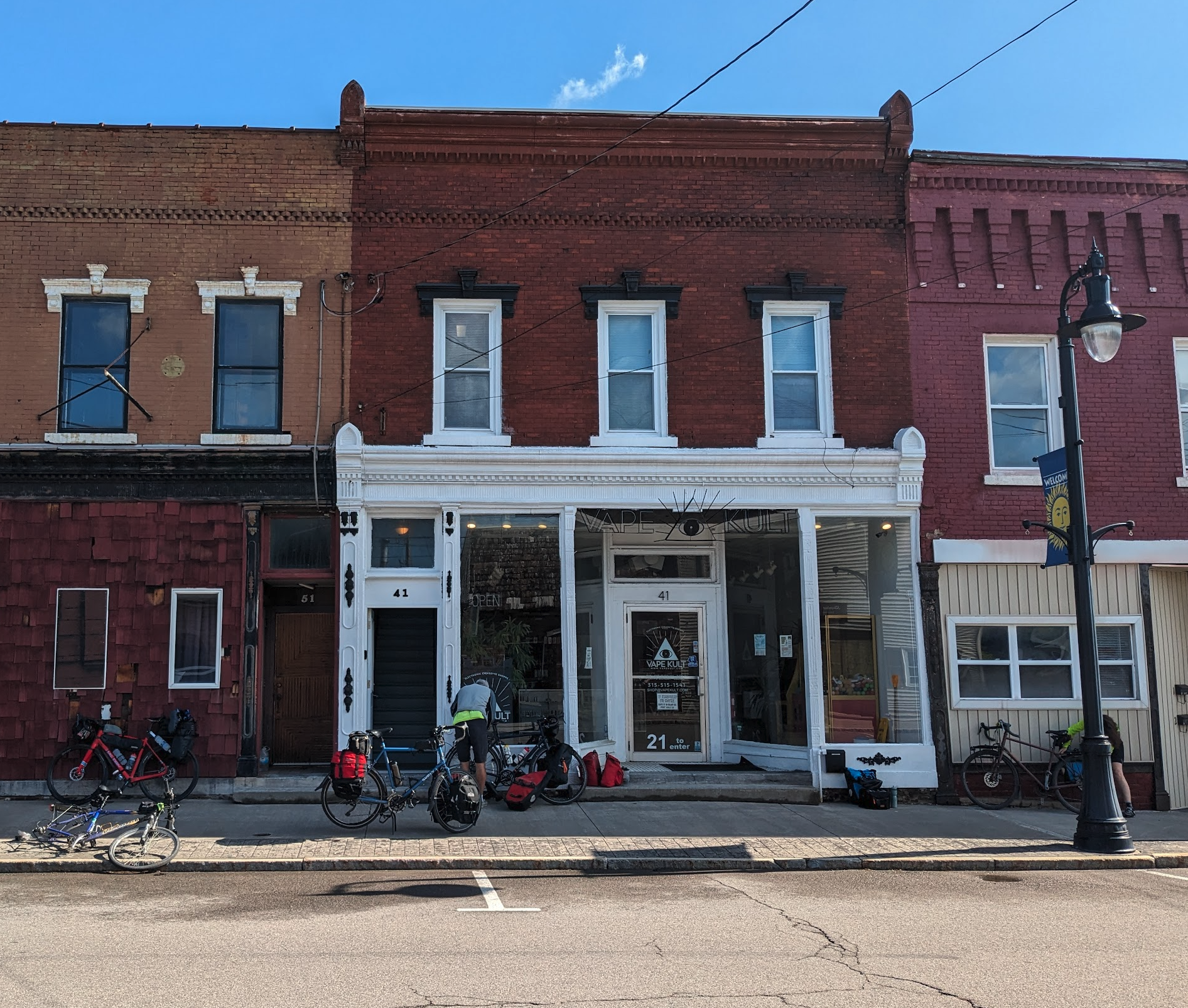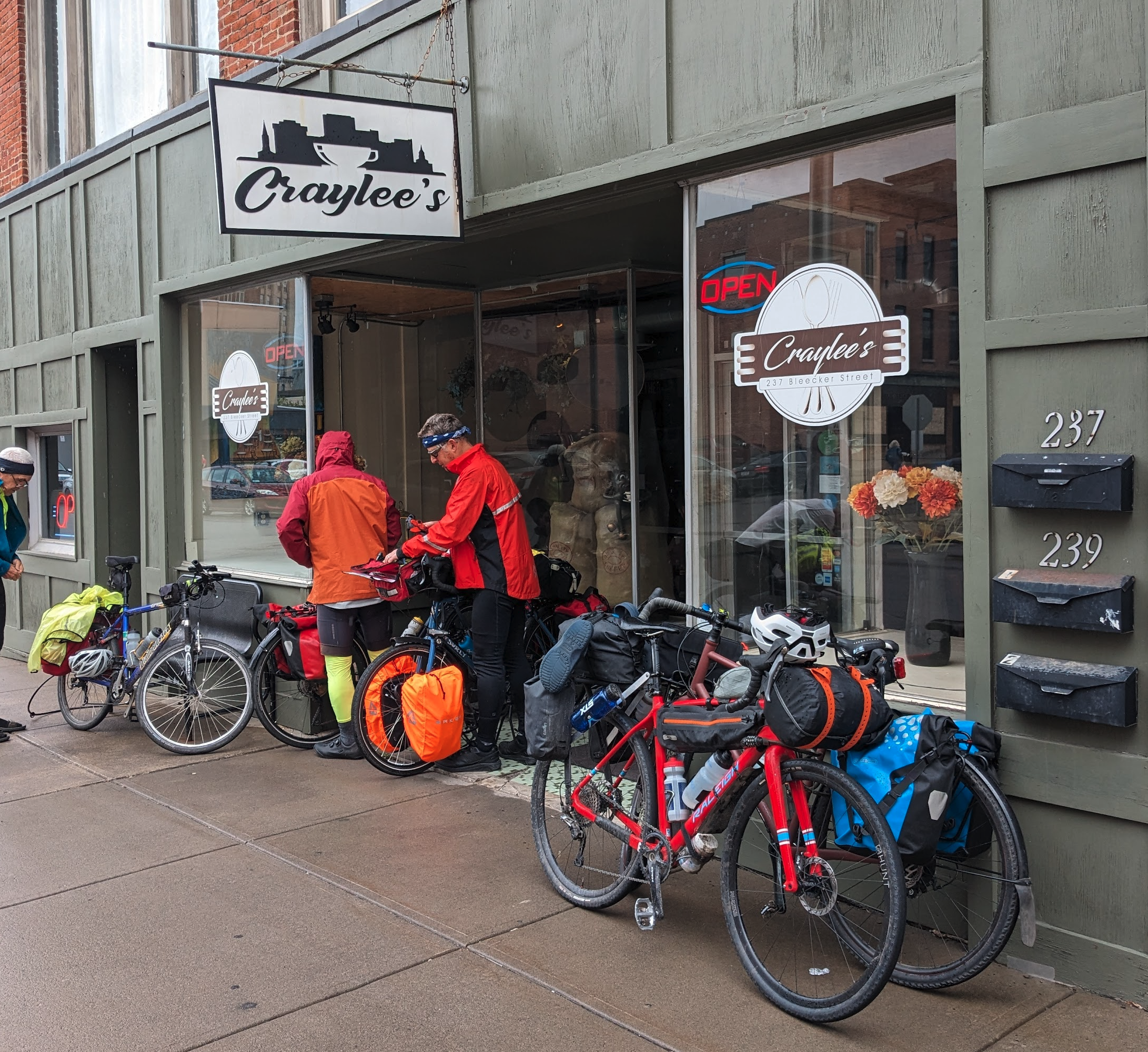 On the way out of Rochester, we were off the trail, but went right through downtown and were treated with smells of Genesee Beer and great rainbows at the falls along the Genesee River. The weather was a bit nicer and the sun came out in the afternoon with temps in the 70s. It was perfect riding. There were a few cute little towns like Fairport where we met a companion, who lives in the area, for the rest of the ride. There was a bit of road riding after lunch (I was still burping up my omelet so did not have anything) and went off the front with Henry who also wanted to get his heart rate up. We arrived in Clyde about an hour before the rest of the group and sat in the local park having an IPA wrapped in a leg warmer (the cyclist version of a brown paper bag). The Air BnB was a “walkup” apartment, pretty cool. But Clyde looks like it doesn’t get much love these days. If you wanted to by a cheap building to do whatever (as long as you don’t need local customers) there’s lots of unoccupied commercial space! The only place open for dinner was a takeout Chinese restaurant, bit it had a few tables so we were able to eat the takeout in. It was good, but I think I over did it on the chilis in my Szechuan Beef though… 🚽