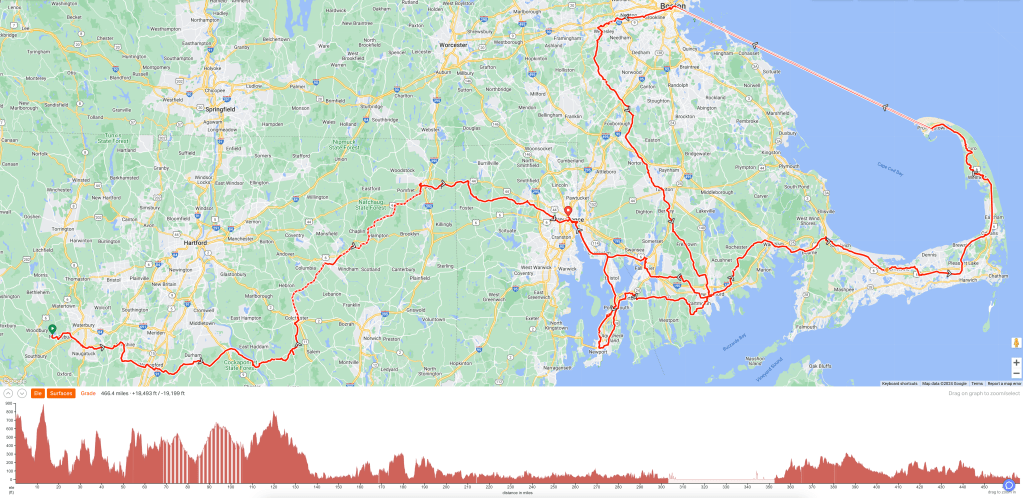 The route I came up with is a mix of new and old ground, but one of the nice things about that is it’s not particularly stressful with so much familiarity. Two years ago, I rode up to Quassy, so I have some appreciation for riding in Connecticut, and essentially continues that ride and recreates some of what I did last summer that I really loved. The route is nine riding days of about 60 miles (or less) each with 2 stops at CT state parks, 2 stops at MA state parks on the Cape, 4 stops with family, a ferry ride and a train ride home, in total about 400 pedaling miles.