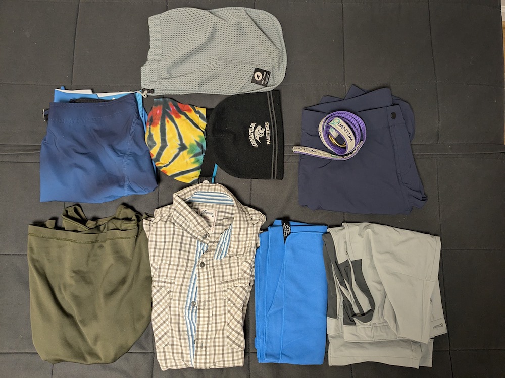 Off Bike Clothes (clockwise from top left): board shorts, underwear, hat, shorts/belt, lightweight long pants, camp towel, collared short sleeve shirt, and tech t-shirt. All of this stuff is “tech” gear so is very lightweight and dries fast. I find the long pants are important mostly for bug protection.