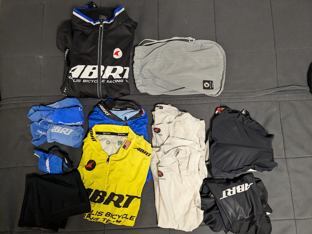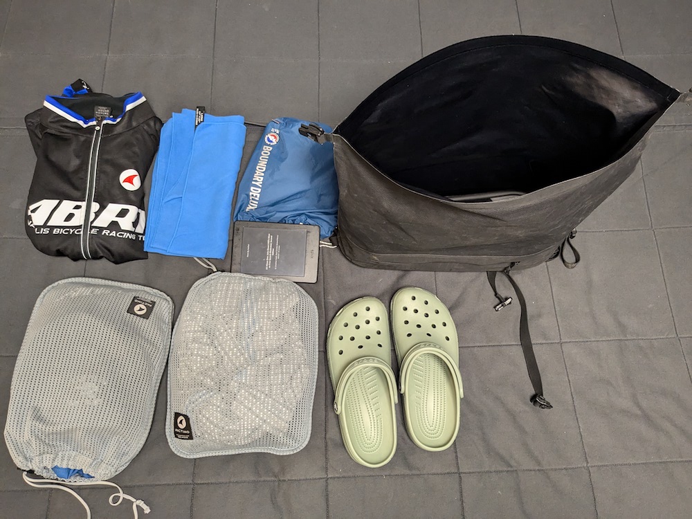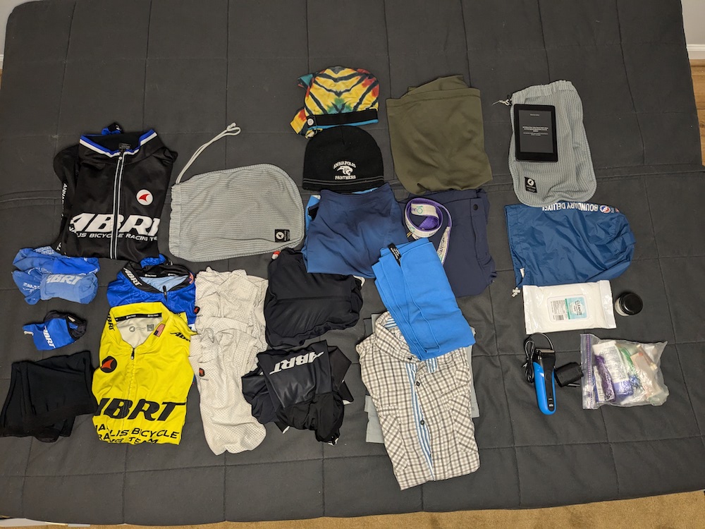 Here’s the detailed list of what I carry. Like backpackers, a good trick is to segment things into other bags so it keeps like things together and you don’t make a mess routing around looking for things. I use the washer bags that Pactimo supplies with their bibs for clothes and a light stuff sack (came with my pad) for the personal items. Everything in one picture: