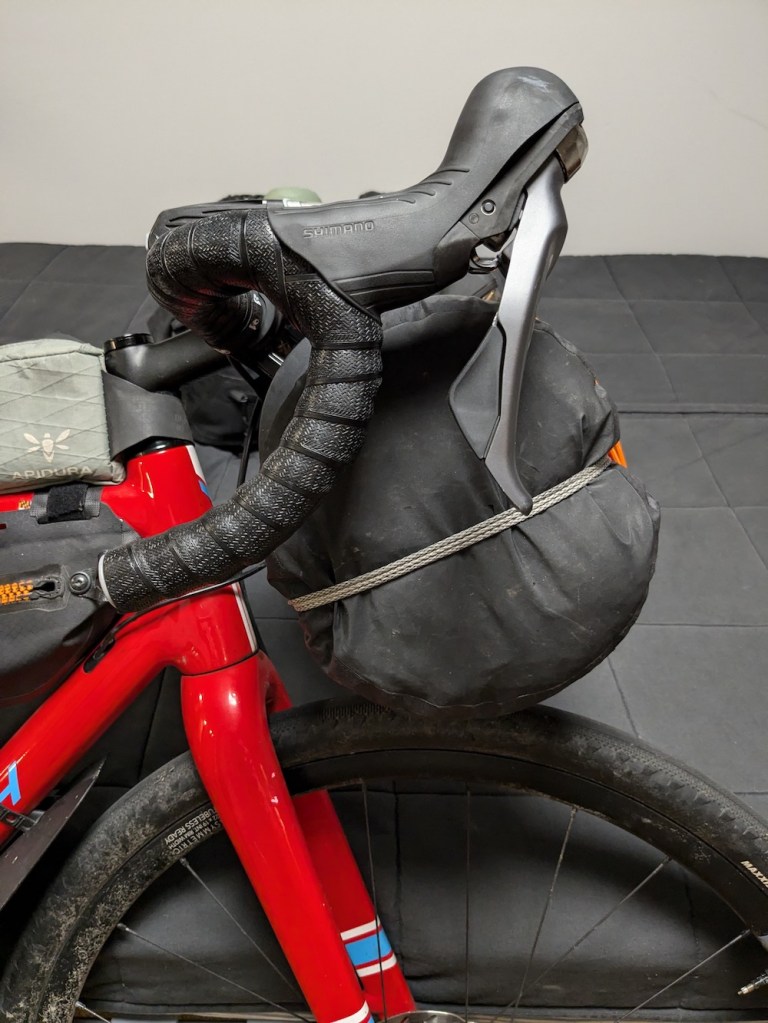 The handlebar bag is just a 20(?)L run of the mill dry bag that I got as a trophy at a regatta. This contains all of my tent gear: Inflatable pillow, Big Agnes 4″ thick pad, Big Agnes Copper Spur 1 person tent (side entry and the bikepacking version with 10″ pole sections) including fly and footprint. I also created a tyvek footprint with a lip to help keep running water under the tent in large thunderstorms from causing wetness. Seems to work well and there is not much of a weight penalty. I fold the pad in 3rds and roll it up with the pillow and put it in the plastic bag to keep it from any wetness in the tent stuff (not uncommon and can be very wet if you packup in the rain). I put the rolled pad bag in, roll the tent poles/stake in the tyvek and place them in the bag. I then stuff the fly, tent and footprint in the bag and seal it up. Counterintuitively, it’s better to crunch and stuff the tent rather than fold and roll it. Just don’t leave it that way too long. I always unload it when I get home, air it out and hang it up.