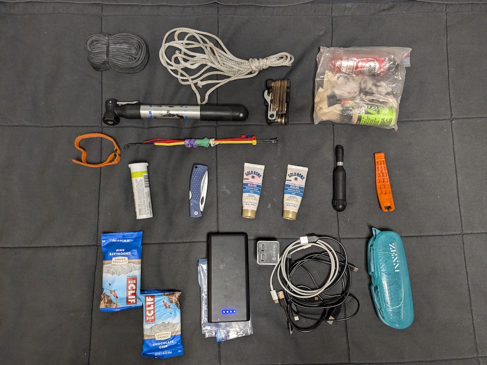 Personal Items: Braun shaver, Kindle, wet wipes, chamois cream, misc toiletries (folding toothbrush, tooth paste, deodorant, lip balm, bandaids, ibuprofen, liquid soap, Neosporin, cortisone cream). Everything except the Kindle goes in the Big Agnes bag. The electric shaver is a bit of an extravagance but I really like being clean shaven and keeps me from feeling disgusting even when I can’t shower. I can generally go 3-4 days without charging it. I copied Ryan Van Duzer on this one. The wet wipes and Neosporin are really important for proper main-taint-tenance. If you start getting a “spot” you gotta jump on it immediately. The Kindle is great because I end up needing to read a lot, it is backlit so you don’t need a reading light, can carry a lot of material, is lightweight and needs infrequent charging.