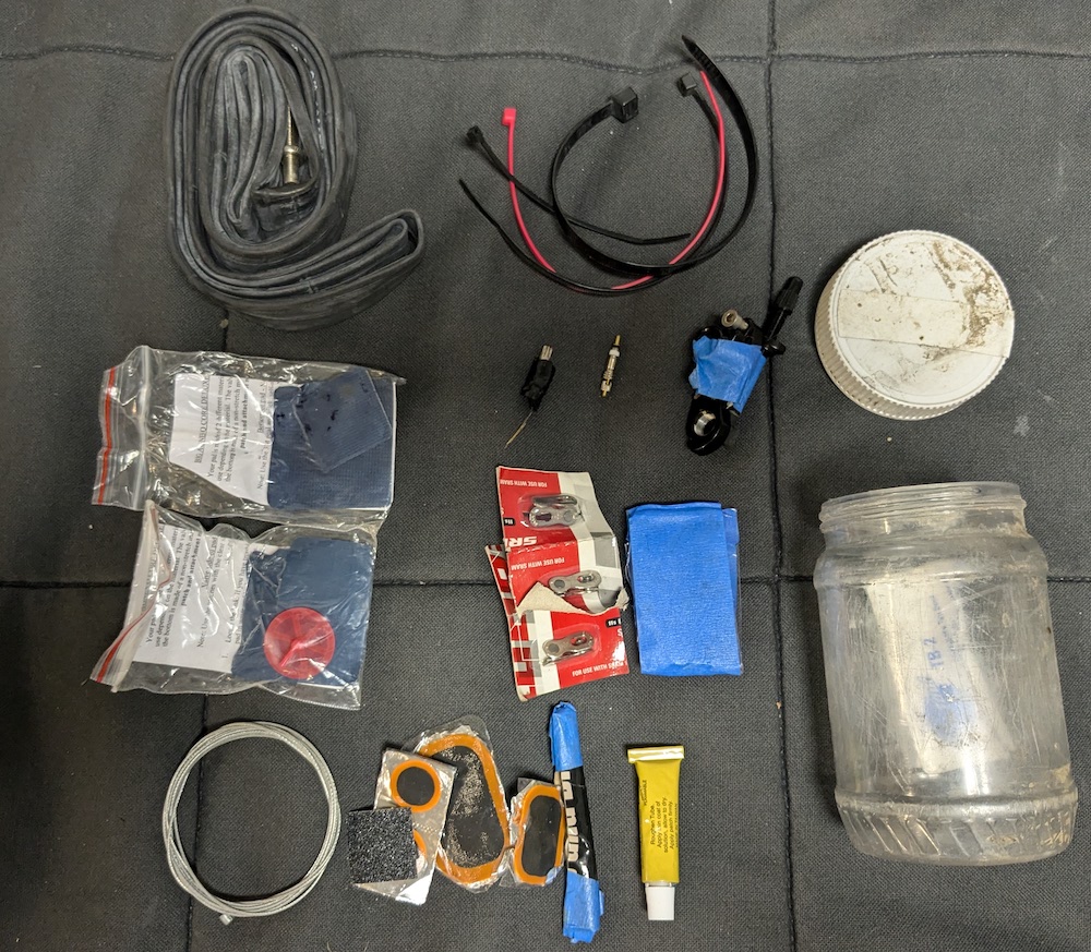 You notice a small (plastic peanut butter) canister under the downtube above? In that is my set of spare stuff might need for very off nominal contingencies, ie the “MacGyver fixes”. Another tube (in case of complete tubeless failure), more zip ties, patches for my sleeping pad, a torx bit, a tubeless valve core, a tubeless valve stem, a derailleur hanger, quick links, extra tubeless plugs (in the blue tape), tube patches and glue, shift cable, Park tire boot (in the jar) and whipping needle/waxed thread in case you get a tire sidewall cut you need to sew together. If it were a longer trip I would add several sets of brake pads. There are not many more contingencies I can think of…
