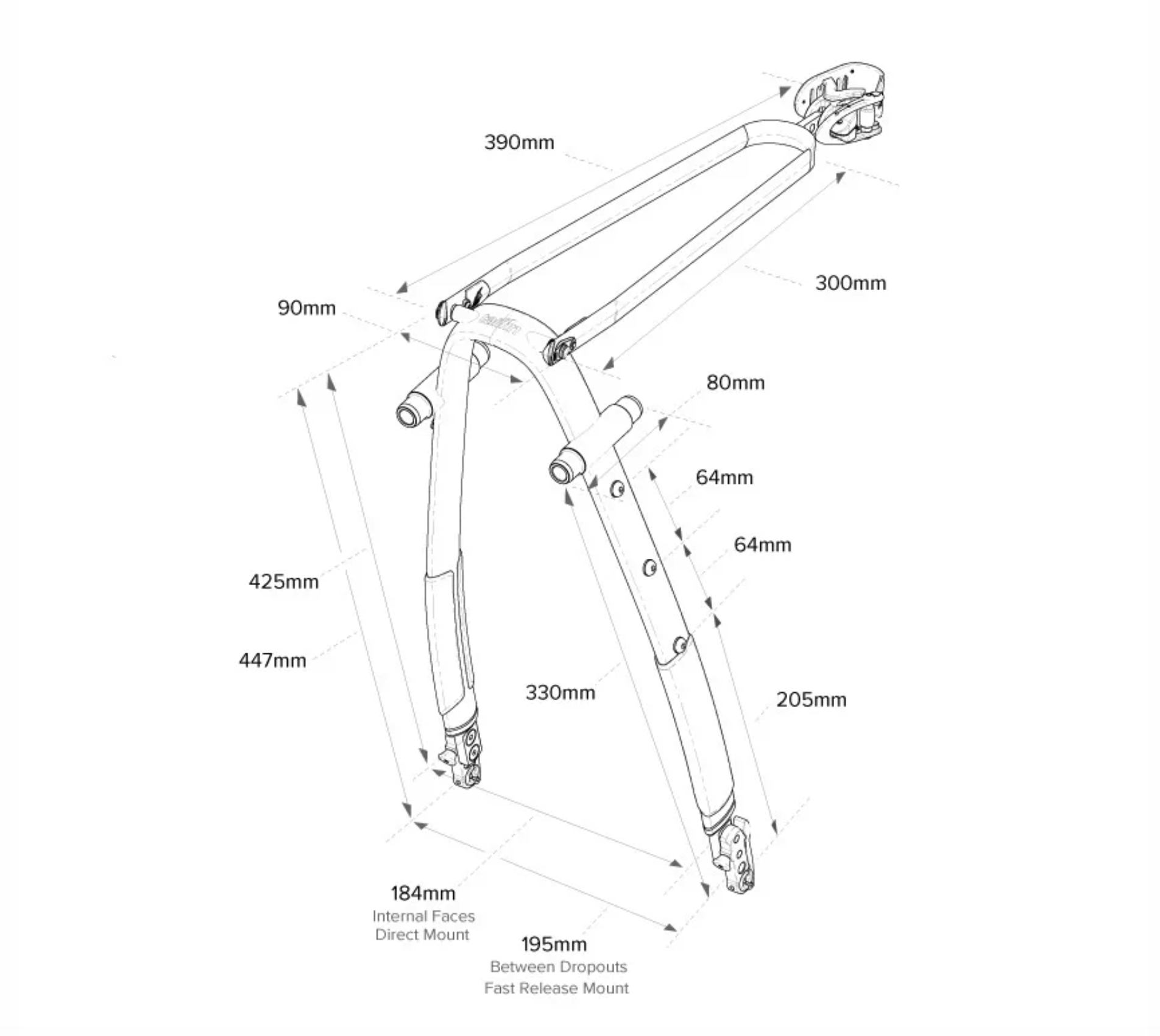 So I started looking around for other solutions and came across Tailfin which has rack/bag systems that seem well engineered, rugged, flexible and mount without touching the frame via a special through axle. Their website makes it very easy to determine what through axle you need to order. I got the alloy rack with pannier mounts. They make a carbon rack which is about half the weight but twice the price. If I were racing the tour divide, I might be more concerned about it (it was used very heavily in 2024), but I did’t want fussy. The basic dimensions are below and you can get all the specs on their website. I also got the extended seat arm so it can be used with a dropper post or if you are going to fill the trunk bag up (which I do) so it won’t interfere with the saddle.