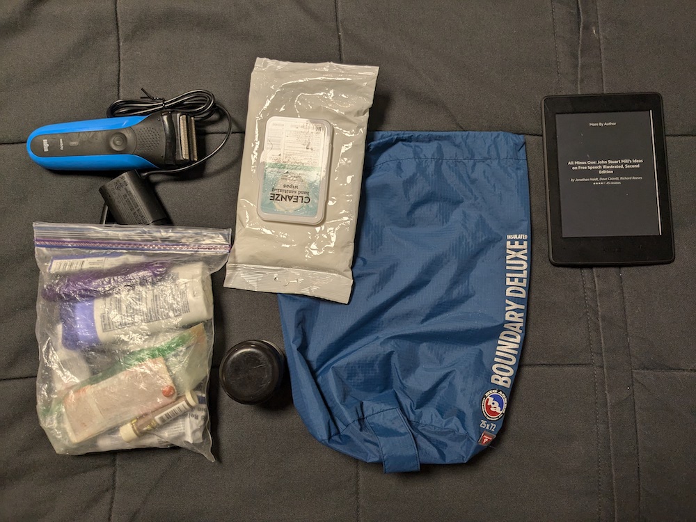 Personal Items: Braun shaver, Kindle, wet wipes, chamois cream, misc toiletries (folding toothbrush, tooth paste, deodorant, lip balm, bandaids, ibuprofen, liquid soap, Neosporin, cortisone cream). Everything except the Kindle goes in the Big Agnes bag. The electric shaver is a bit of an extravagance but I really like being clean shaven and keeps me from feeling disgusting even when I can’t shower. I can generally go 3-4 days without charging it. I copied Ryan Van Duzer on this one. The wet wipes and Neosporin are really important for proper main-taint-tenance. If you start getting a “spot” you gotta jump on it immediately. The Kindle is great because I end up needing to read a lot, it is backlit so you don’t need a reading light, can carry a lot of material, is lightweight and needs infrequent charging.