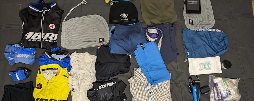 Here’s the detailed list of what I carry. Like backpackers, a good trick is to segment things into other bags so it keeps like things together and you don’t make a mess routing around looking for things. I use the washer bags that Pactimo supplies with their bibs for clothes and a light stuff sack (came with my pad) for the personal items. Everything in one picture: