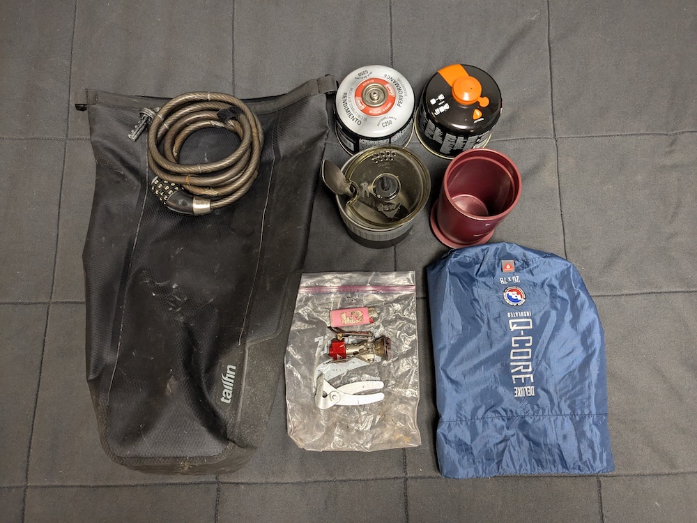 The stove/lighter/handle nest into the plastic mug which goes into the pot with a canister on either end and into the bag. I toss my lock on top of it and maybe some food stuff to pad it out.