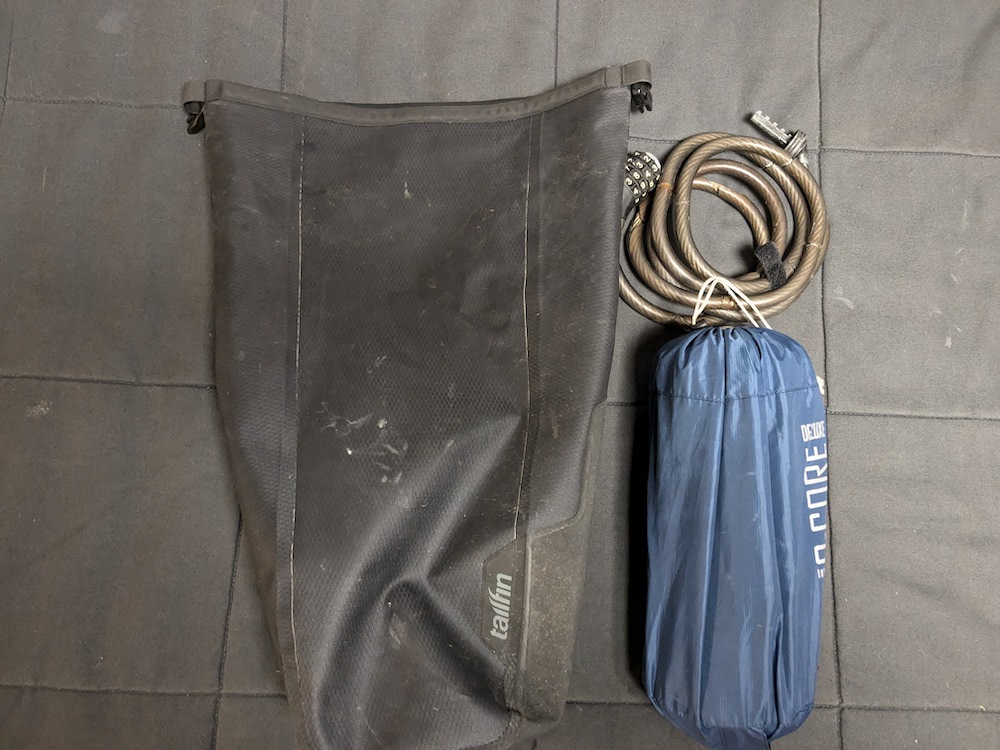 This bag has most of the things I will use every day, bike clothes, after bike clothes and personal items. It’s very easy to remove and carry from the bike and take into where I am staying (either the tent or someone’s house).