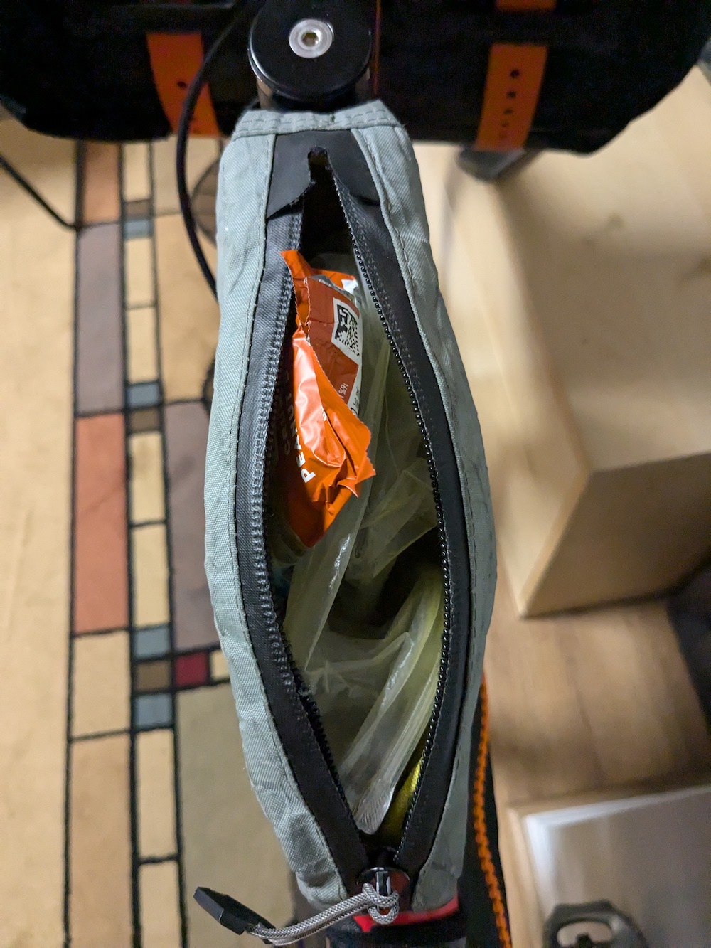 Top Tube Contents: Phone, bag of cash/change (and can put the phone in if really wet) and a cliff bar.