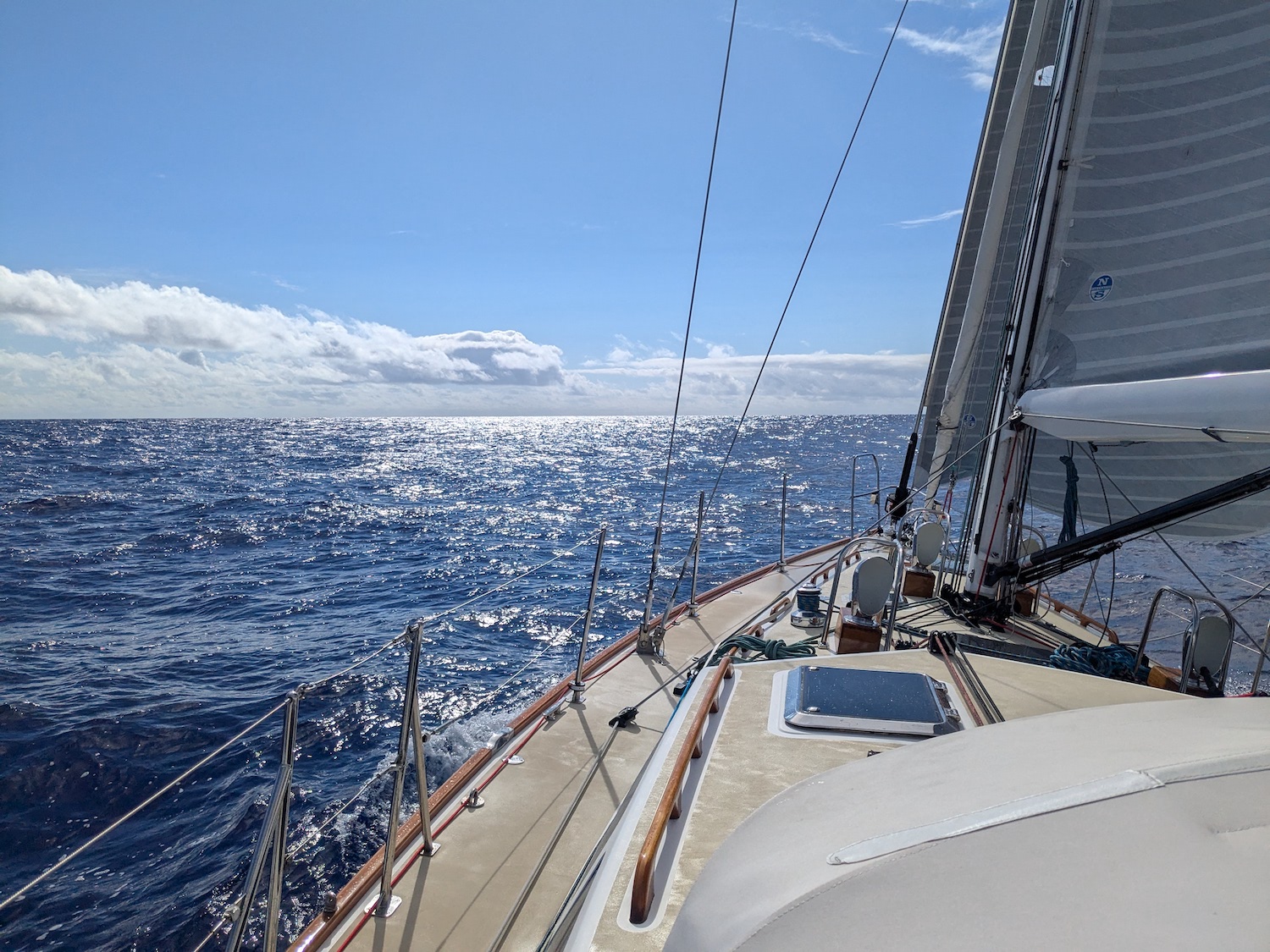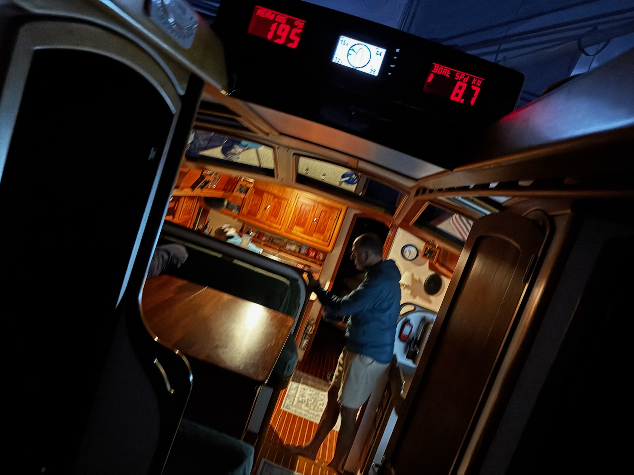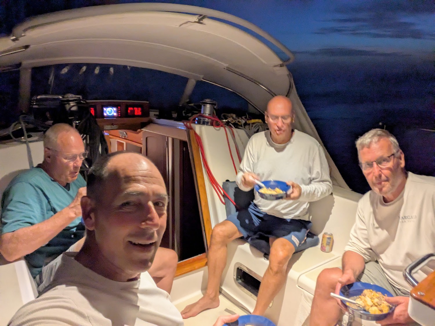 With four competent sailors we kept an interesting and relaxed watch schedule of “3 on, 9 off” between 0600 and 1800 and “2 on, 6” off between 1800 and 0600 which allowed for longer periods of sleep, shorter night watches and a rotation of the night watches. The tradeoff was most of your watches were solo (thus requiring competent sailors) and of course if you needed help, you called for it, and I often came up early and stayed late for the company. As we trucked south, the weather warmed with water temps eventually in the high 80s and it started to get pretty uncomfortable sleeping below since we could not have any hatches open. But watches were pleasant in a t-shirt and shorts or perhaps a light jacket.