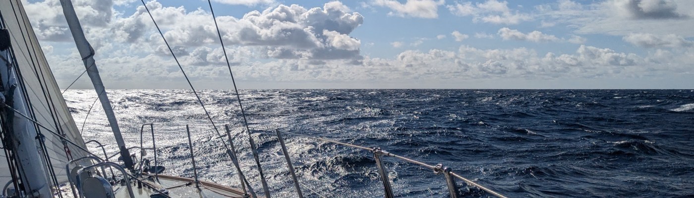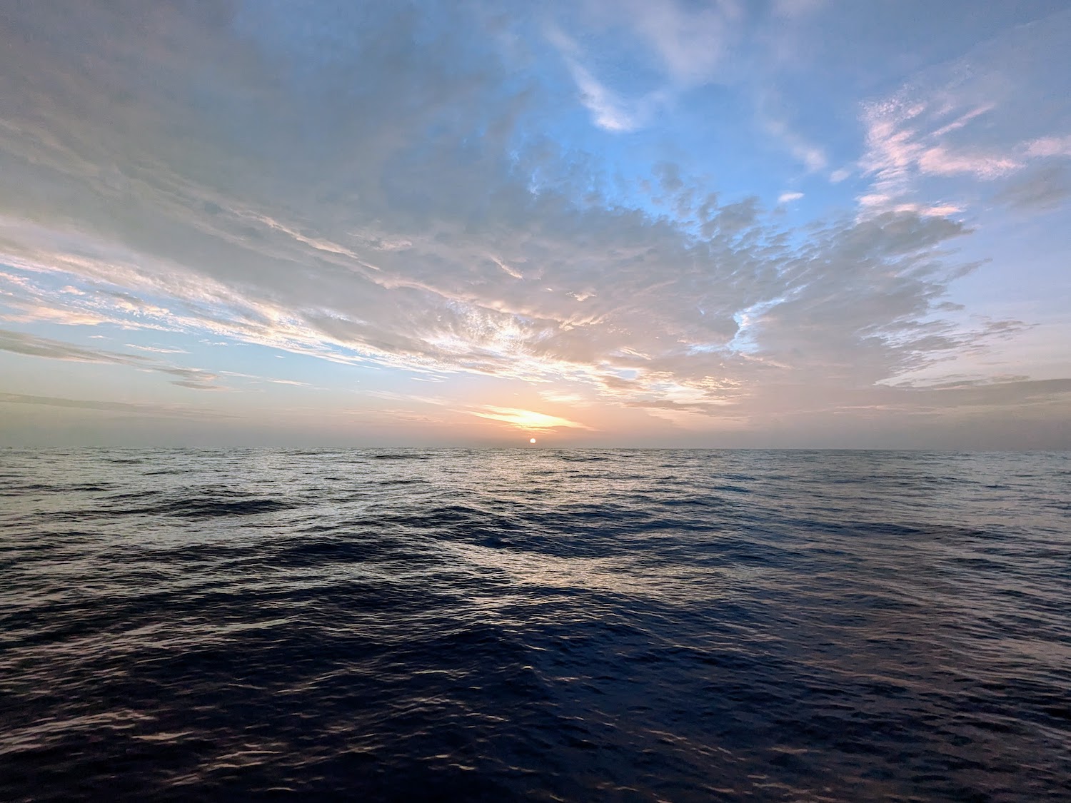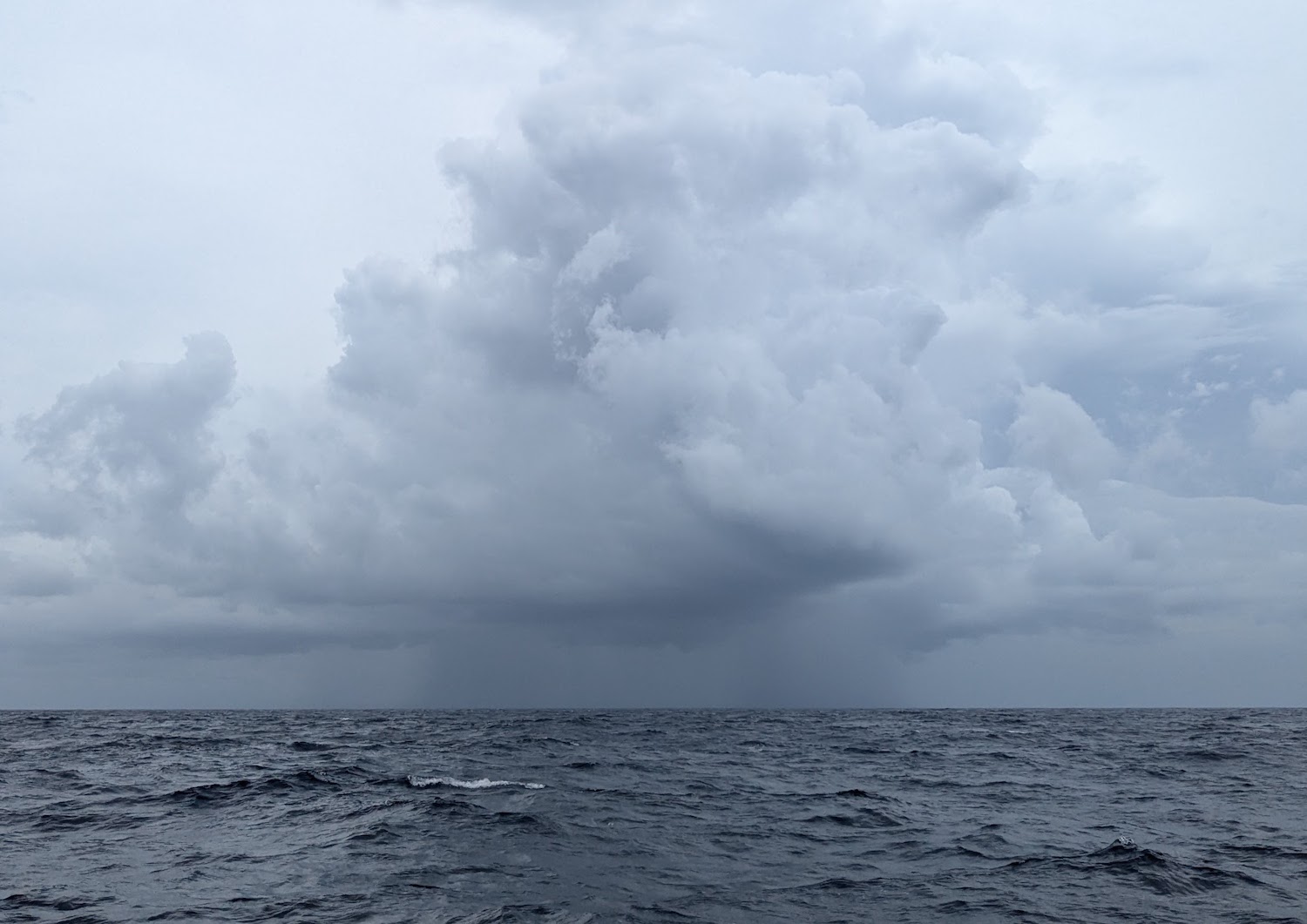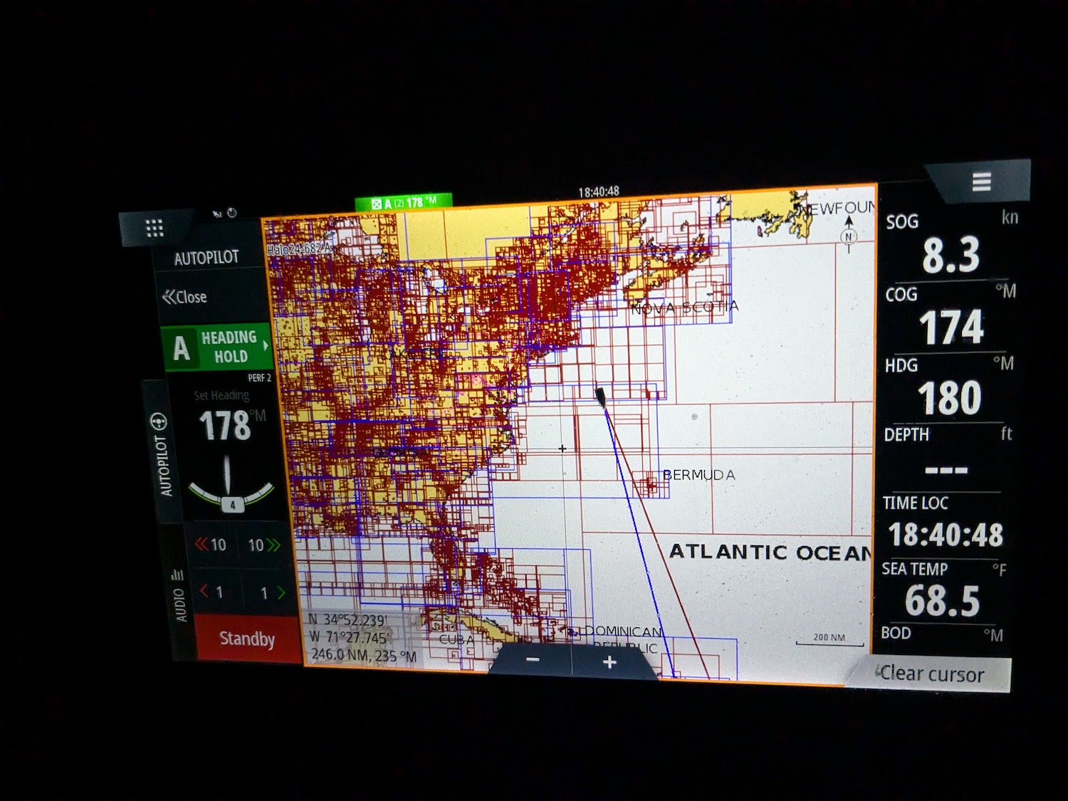 With four competent sailors we kept an interesting and relaxed watch schedule of “3 on, 9 off” between 0600 and 1800 and “2 on, 6” off between 1800 and 0600 which allowed for longer periods of sleep, shorter night watches and a rotation of the night watches. The tradeoff was most of your watches were solo (thus requiring competent sailors) and of course if you needed help, you called for it, and I often came up early and stayed late for the company. As we trucked south, the weather warmed with water temps eventually in the high 80s and it started to get pretty uncomfortable sleeping below since we could not have any hatches open. But watches were pleasant in a t-shirt and shorts or perhaps a light jacket.