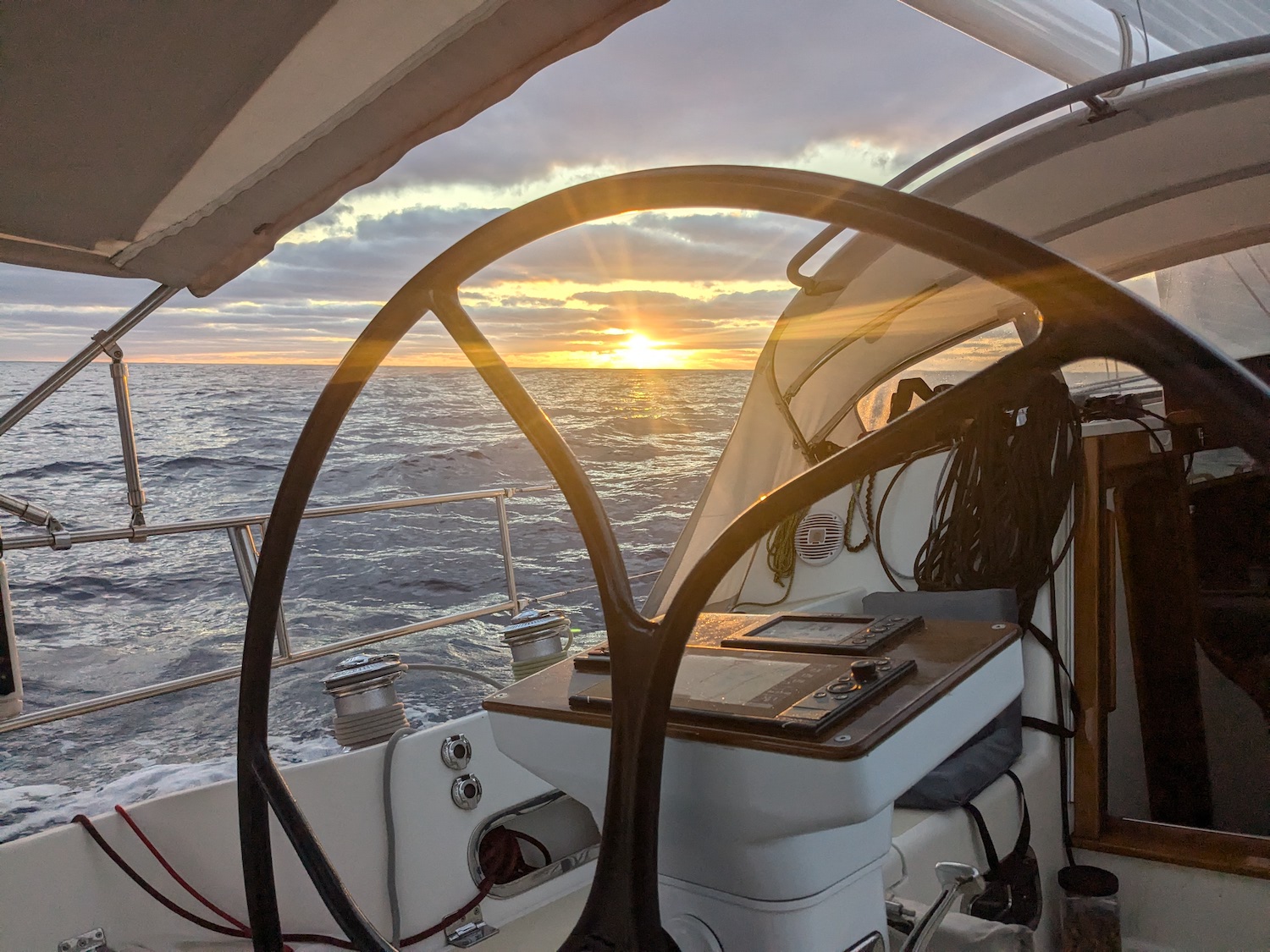 After three days we were all getting itchy to get underway again and since the weather was clearing up south it was time to get rolling. We left St. George’s in the late morning and from there it was the typical “wash, rinse and repeat” of offshore sailing continuing with incredible sunsets, sunrises and the beginnings of a new Moon to brighten the night sky a bit. The leg to Bermuda was extremely dark at night due to no Moon, but when it was clear throughout this trip Mercury and Jupiter were insanely bright. The typical view at night was the procession of the constellation Orion across the sky, like an old friend. For the most part we had an easterly breeze on the port beam ranging from 10-25 kt and easily were averaging about 8.5 knots plus or minus. The Morris 48 is a powerful boat with a deeper keel and tall carbon rig so we could easily maintain that speed with even a double reef (we only had reefs 2 and 3 rigged) and a staysail. But, we often switched between the no reef/2nd reef and the jib/staysail depending on the breeze. Both jibs were on roller fullers and both sets of winches were electric, so it made it easy for us 60+ dudes. We did have a 24 hour period of very little wind in the middle of the leg as we transitioned to the next system but fortunately Margalo motors comfortably at about 8 kts, so other than the steady drone of the engine it was no biggie.