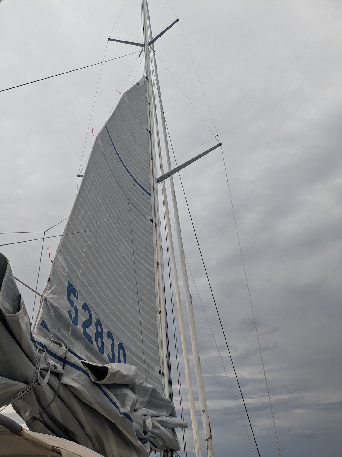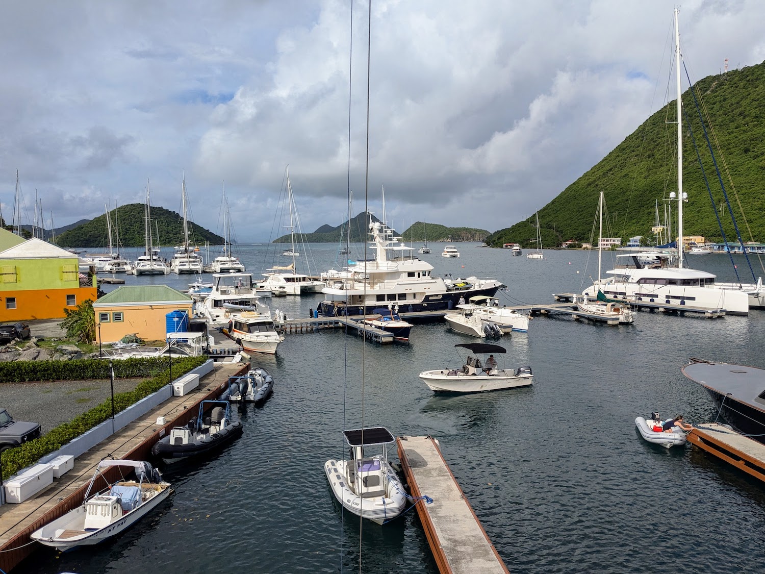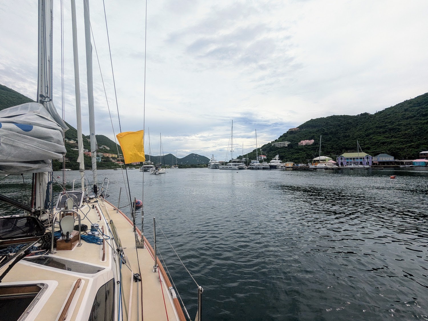 It was only the last 6 hours that the remnants of the unsettled weather close to Tortola made it a little spicy. I got off watch at 0000 with the usual 15-20 kts and some minor squalls around and went to sleep. I woke up several hours later to some chatter on deck about the weather, a third reef and course change running more downwind as the breeze built into the 30s. The motion of the boat was very awkward due to the sea state and a couple of times in my bunk I was thinking “please come back down, please come back down” when a wave would round us up a bit. I got up, dressed and lent a hand. We rolled up the staysail and came back up to course with just the triple reef still making almost 9 knots comfortably for the rest of the night as we endured squalls, lightning and a steady 30 kts. Fortunately the lightning was very diffuse and never close. By day break, the squalls receded, the breeze abated and we added more sail. Ultimately with about 10 miles to go the breeze headed us 90+ degrees and went down to under 10 knots so we just fired up the engine and motored into the sloppy conditions the last two hours into Soper’s Hole at the west end of Tortola. A bit anticlimactic, but that’s how cruising goes.