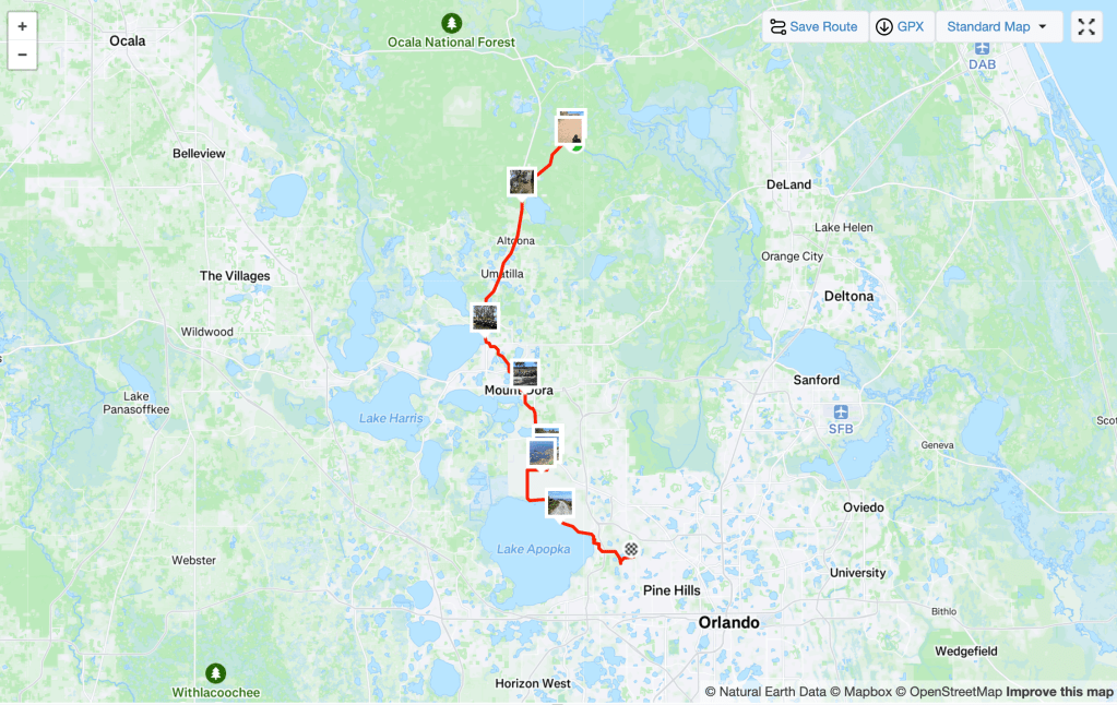There were a number of highlights of the route: Etoniah Creek State Forest north east of Palatka, Ocala National Forest/Alexander Springs Recreation Area, the lakes region including Eustis and Lake Apopka’s north shore, Three Lakes Wildlife Management Area and Everglades and Francis S. Taylor/Loxahatchee Wildlife Management Area between Lake Okeechobee and the Ft Lauderdale metro area. Since I had ridden around Lake Okeechobee last year, that was all familiar ground.