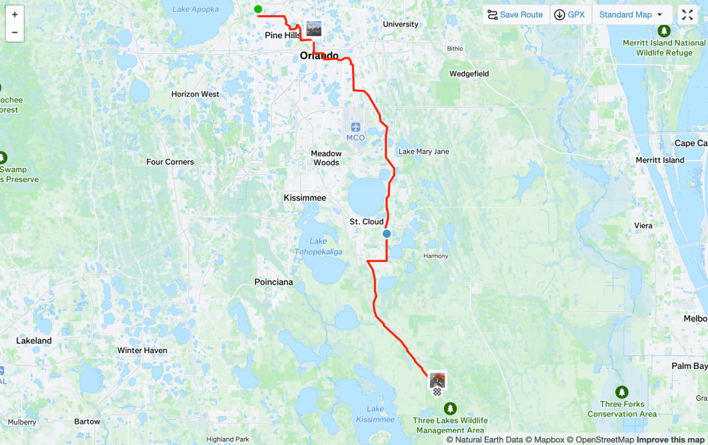 After winding through downtown Orlando, it was the tour of the hierarchical road network, everything from neighborhood streets, collector roads and STROADS; at least in Florida when they blow a crap ton of money on a STROAD they at least put in a decent bike lane. And the nice thing about STROADS is with cars going by at 50 mph, they create a nice draft so I was able to go pretty quickly. The last 20 miles was basically on a two lane country road (no shoulder though), long straight, flat with lots of ranches and farms either side but at least I had a decent tailwind. Once out of Orlando I didn’t take many pictures because it just wasn’t that interesting; we all know what arterial strip malls, Wawas and Florida suburban subdivisions look like.